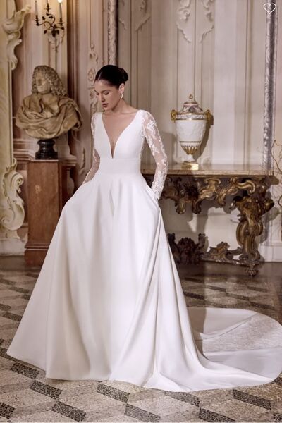 Lisbeth - Matte satin A-line gown with a plunging V-neckline with center front illusion V inset. Bodice is finished with an inset waist. Features tulle long sleeves with a puff shoulder and beaded & sequined lace appliques that continues onto…