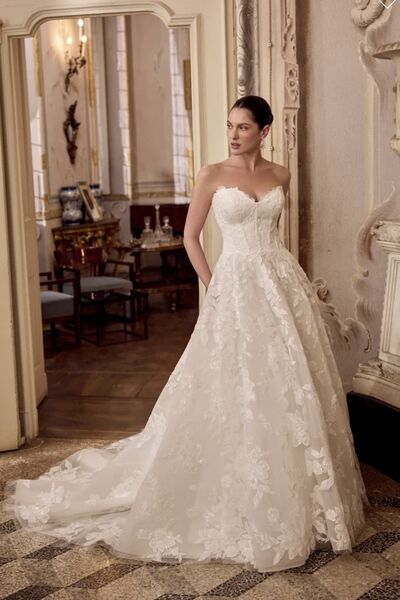 Leigh - Mikado fit & flare gown with a strapless modified sweetheart neckline. Matte lace appliques flow through the bodice and throughout the skirt. Adorned with 3D flowers with tonal bugle beads & sequin details. 3D embroidered flowers also adorn…