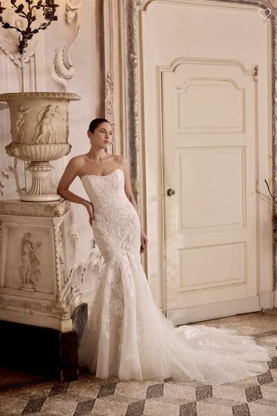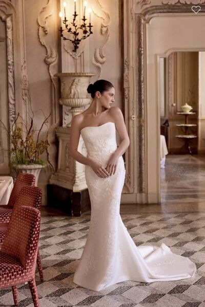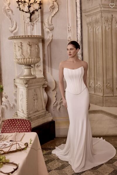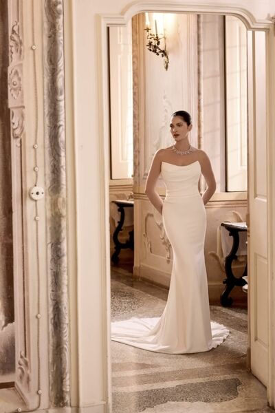 Leti - Clean crepe fit & flare gown with strapless cat eye neckline. Features draping at the neckline and flattering ruching across bodice. Soft draping continues on top of skirt. Finished with buttons to end of chapel length train. Cape…