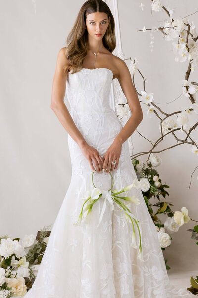 Leigh - Mikado fit & flare gown with a strapless modified sweetheart neckline. Matte lace appliques flow through the bodice and throughout the skirt. Adorned with 3D flowers with tonal bugle beads & sequin details. 3D embroidered flowers also adorn…