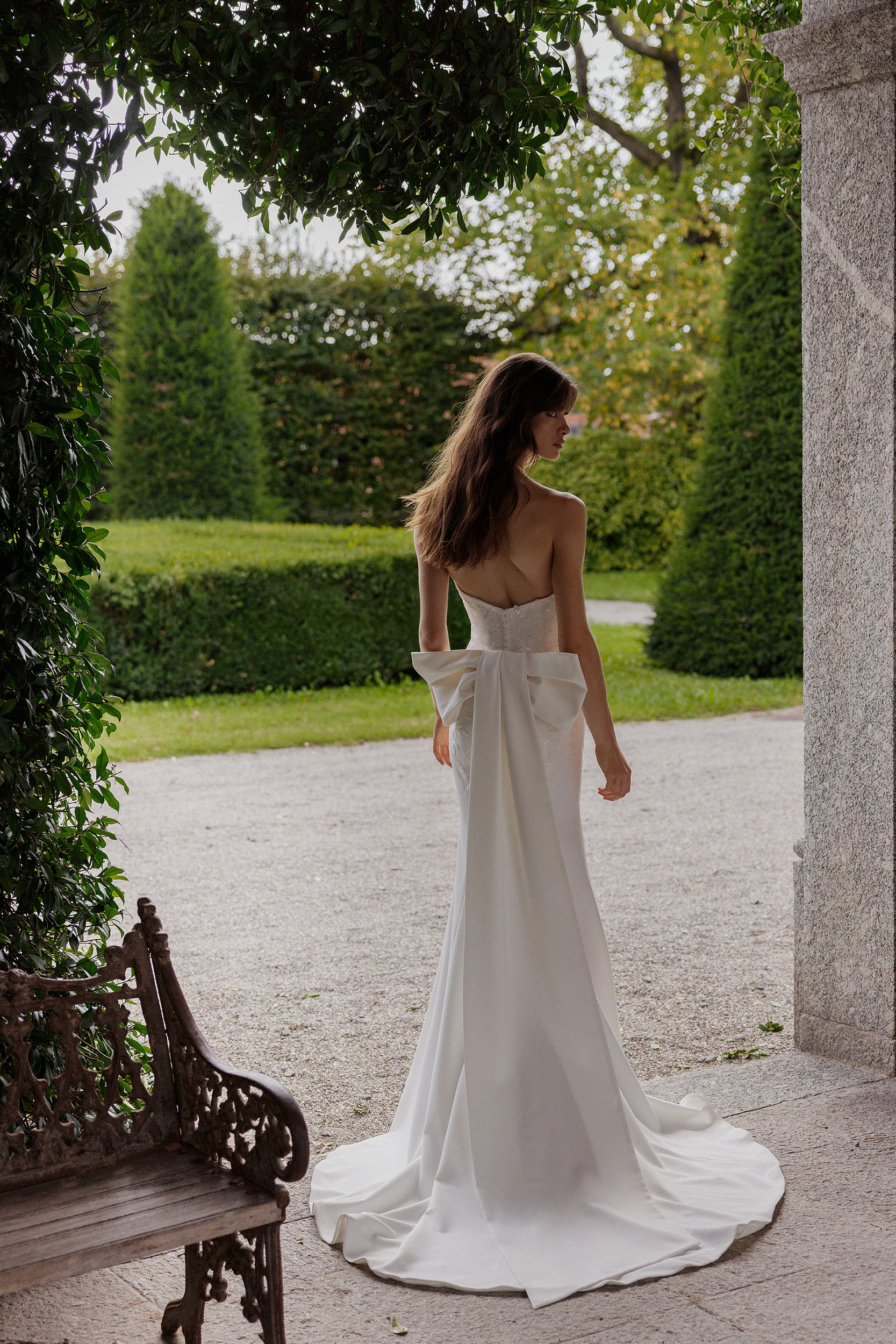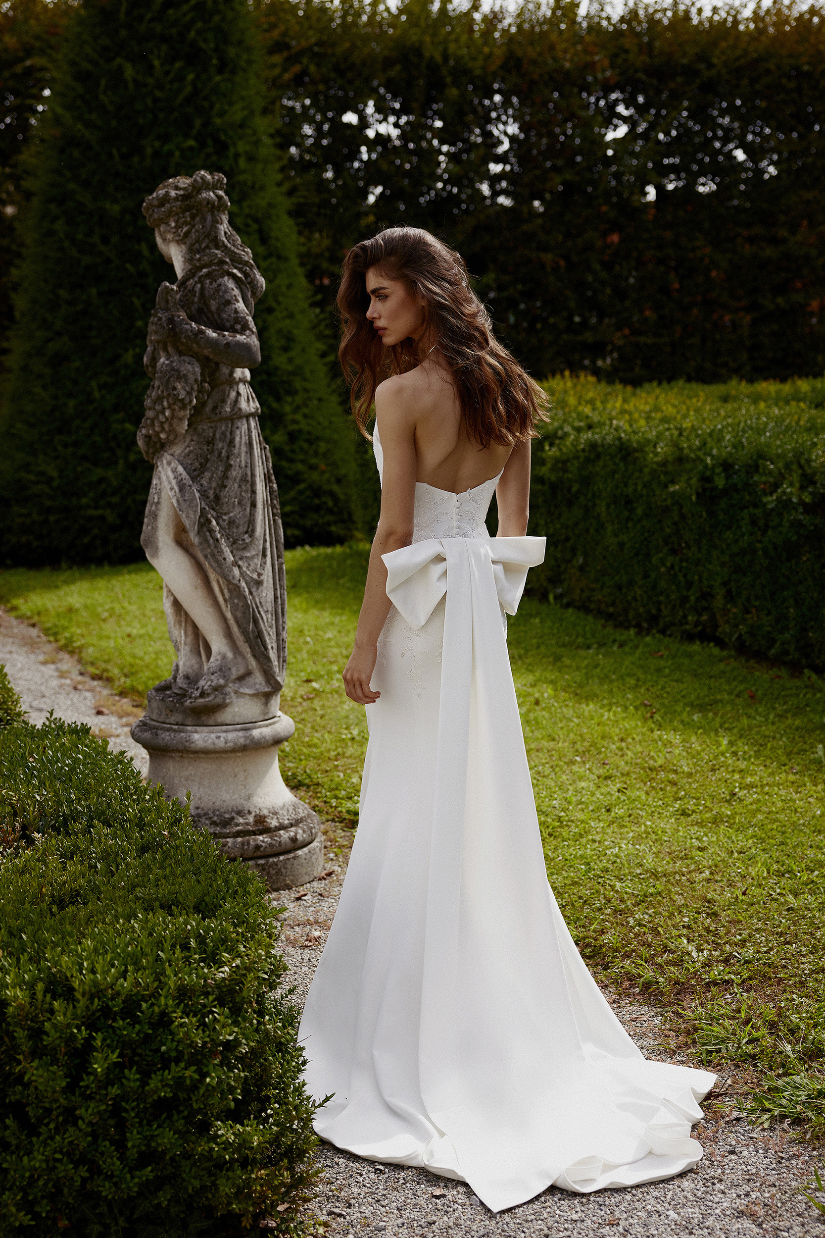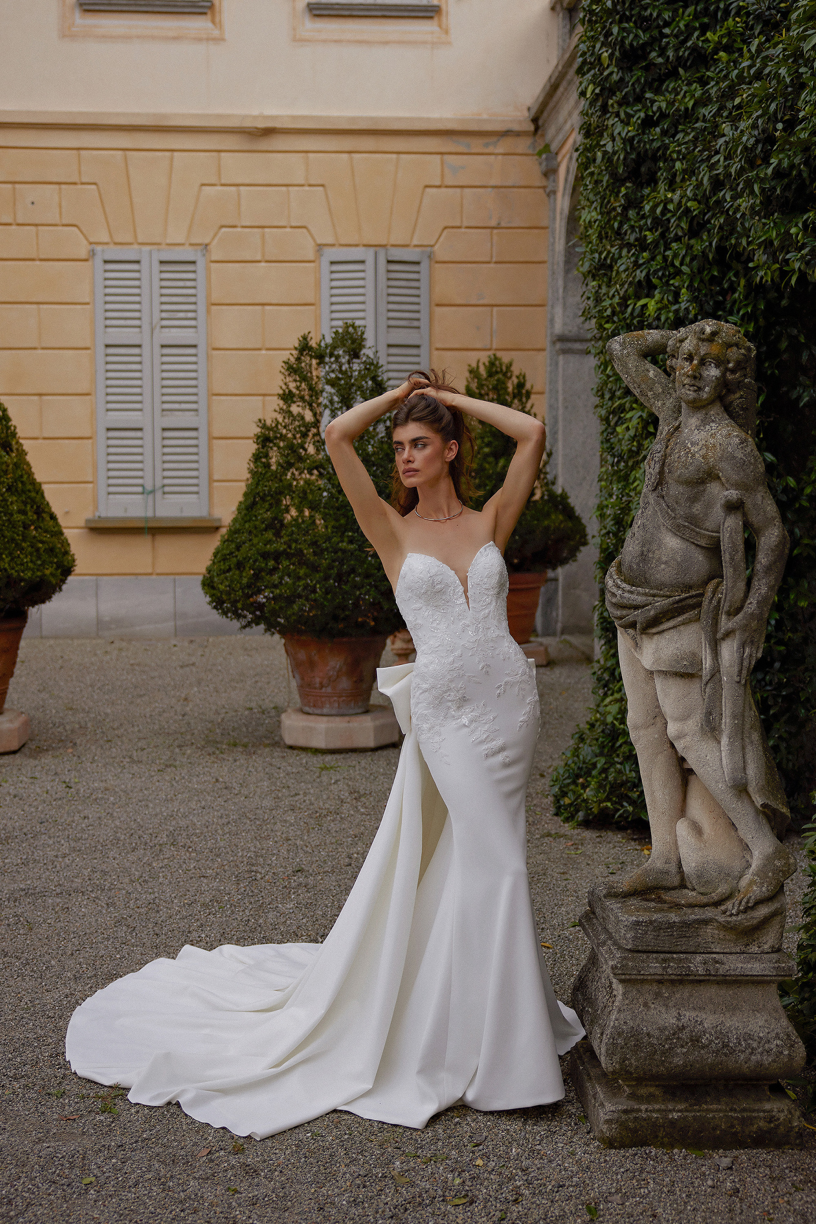 Stretch crepe fit and flare featuring pointed sweetheart neckline with plunge. Gown embellished with tonal beaded and sequined lace appliques that trickle down hips. A detachable stretch crepe bow with streamers is included with dress and details back waistline. Style complete with crepe covered buttons down back and a sweep length train.
