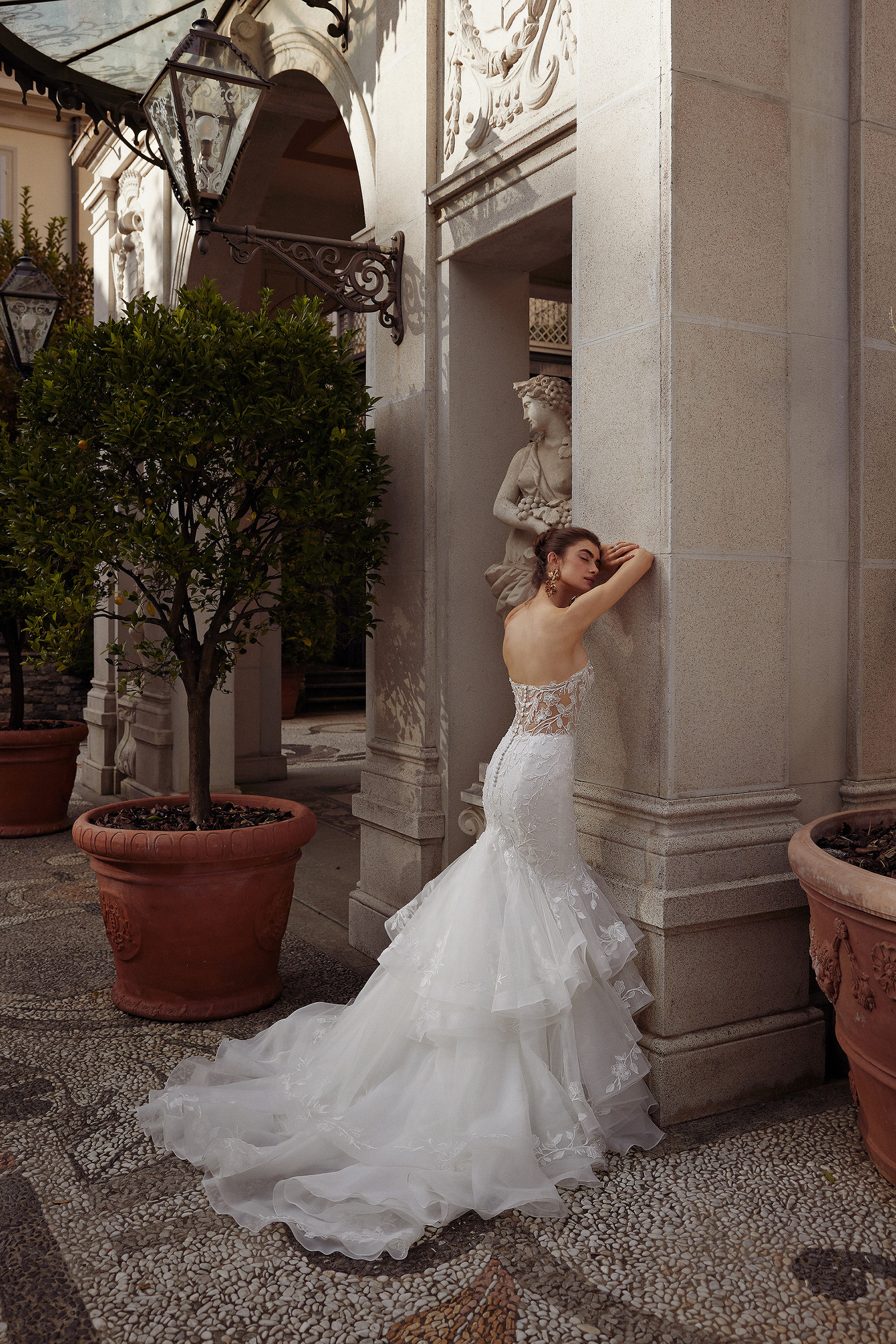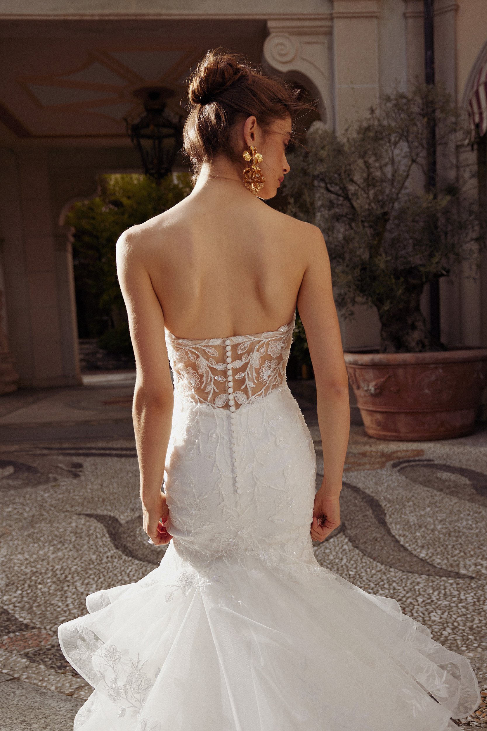 Strapless trumpet gown with ruffle skirt. Designed with a plunging sweetheart neckline detailed with subtle demi cup seaming. Sheer bodice detailed with a sparkle tulle underlay to side seams. Dress embellished with sequined and tonal beaded embroidered appliques. Horsehair defines the hem of each tier on skirt. Sheer back finished with sparkle tulle covered buttons and a chapel length train.