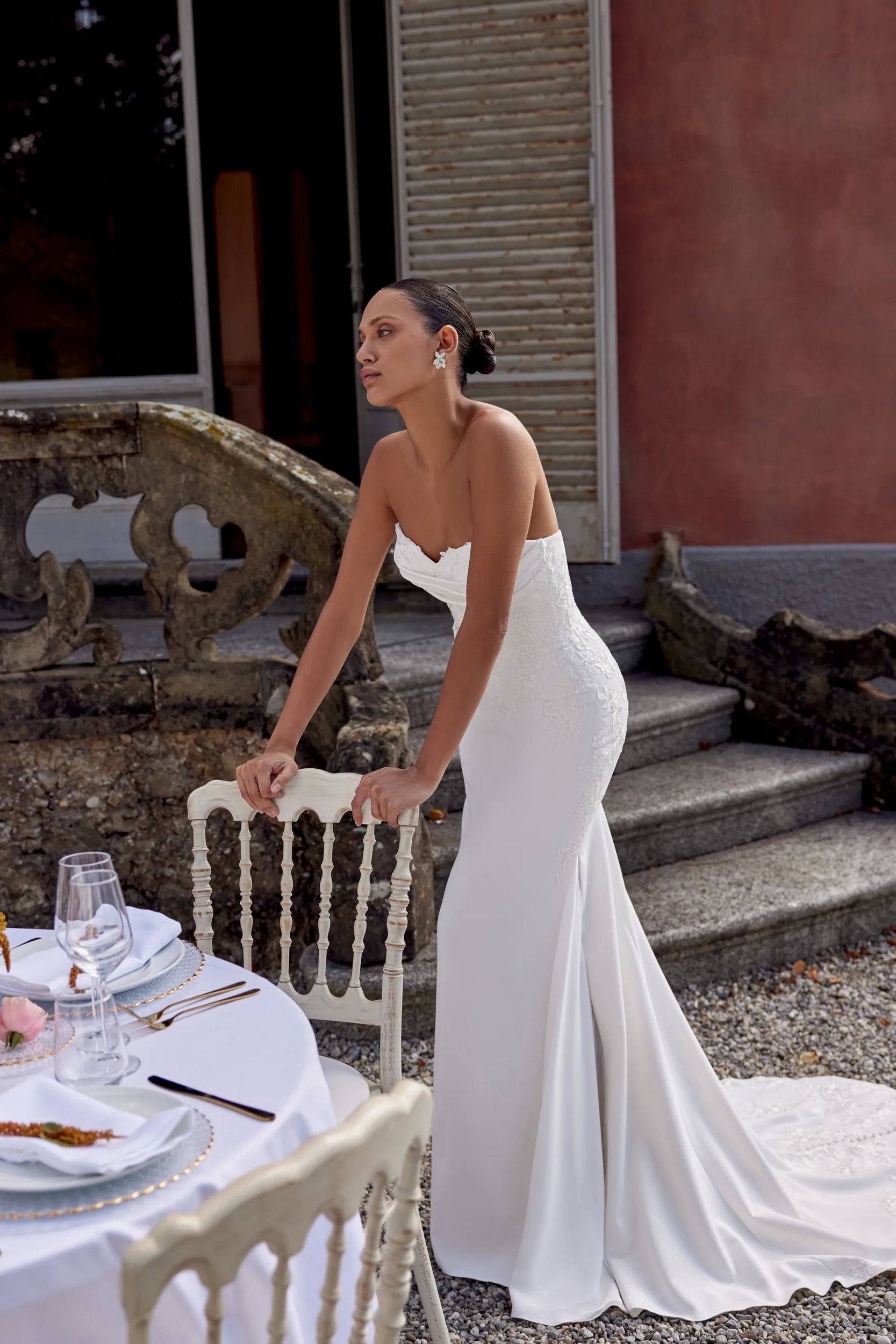 Kai - Stretch crepe fit and flare gown with strapless sweetheart neckline. Features pleated draping at the neckline with matte lace appliques peeking out. Adorned with matte lace appliques throughout the front and back of the bodice, trickling down to the top of the side godets. Finished with buttons from top of back neckline to end of chapel length train. Matte lace detailing along hem of train.