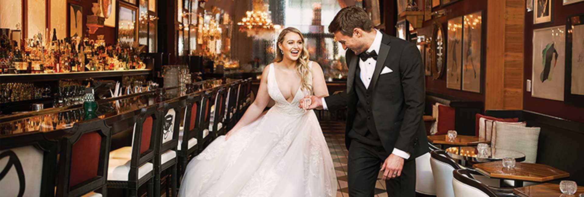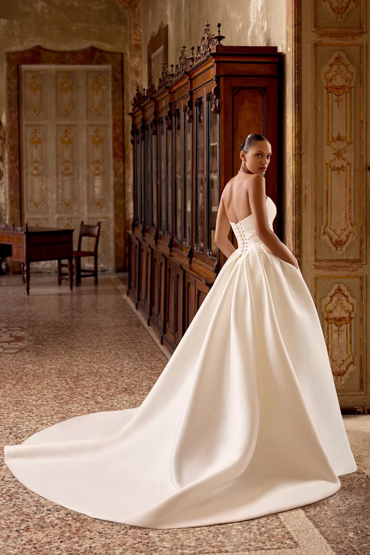 Kelsey - Clean Stretch Mikado ball gown with strapless cat eye neckline. Bodice features ruching across front and back. Skirt is accented with knife pleating at the basque waistline and includes pockets. Finished with a lace up back with a modesty panel. Complete with a chapel length train.