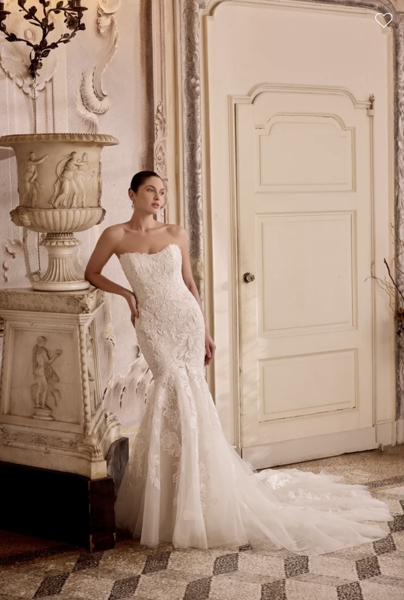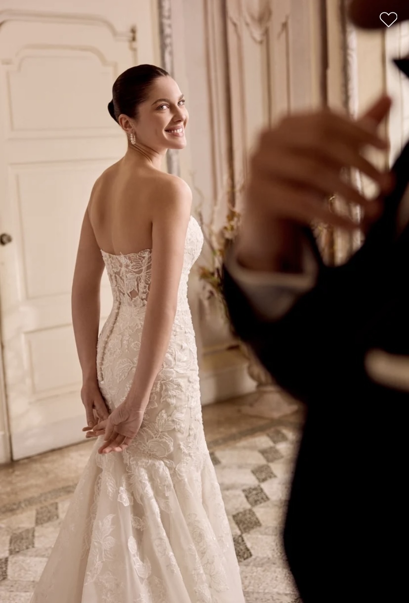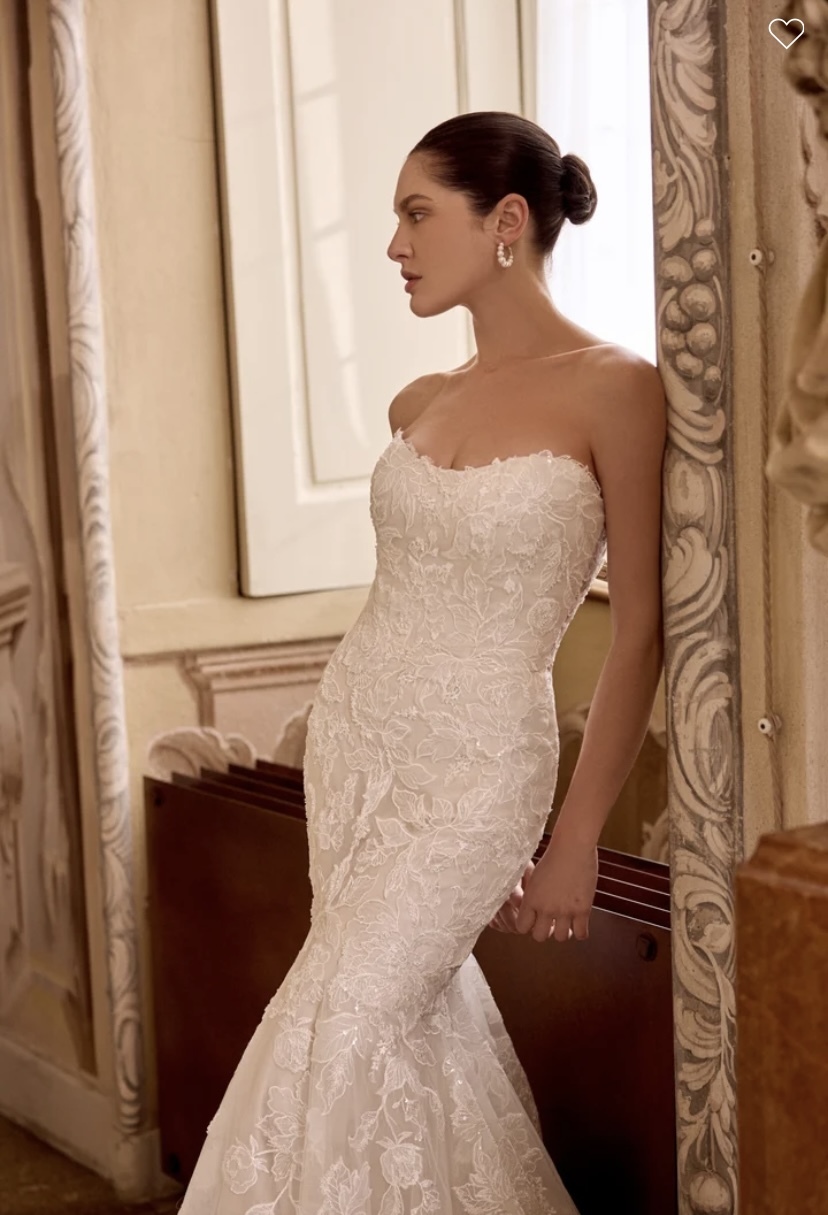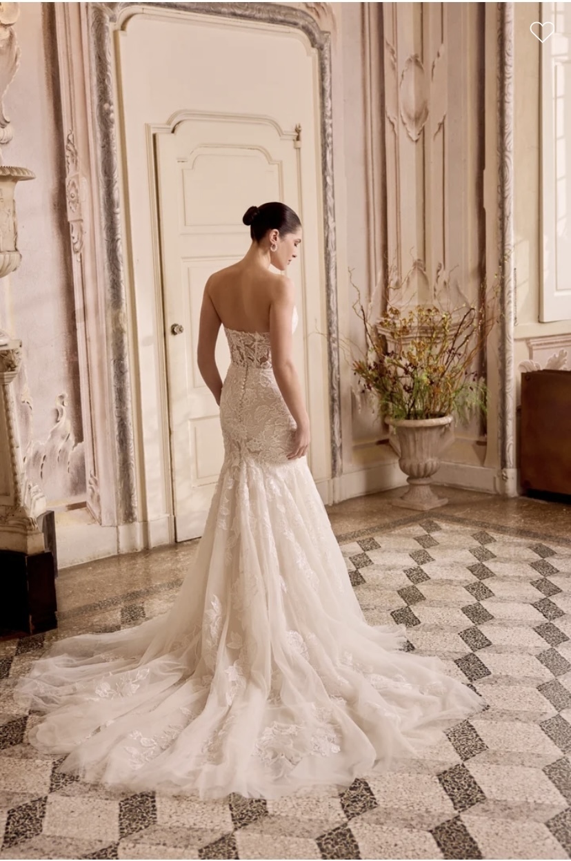 Lorenna - Sparkling lace fit & flare gown with strapless cat eye neckline. Gown is adorned with beaded & sequined lace appliques all throughout with tulle peeking out from under appliques on skirt. Beading includes tonal seed beads and sequins. Sheer back is adorned with lace appliques which reveals exposed boning. Finished with buttons to end of the zipper. Complete with a chapel length train.