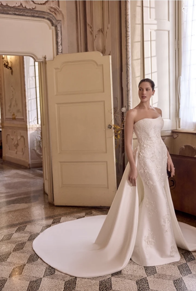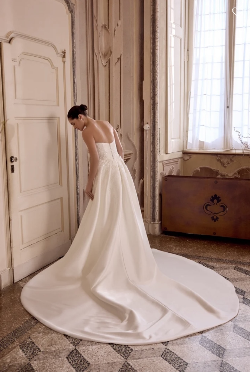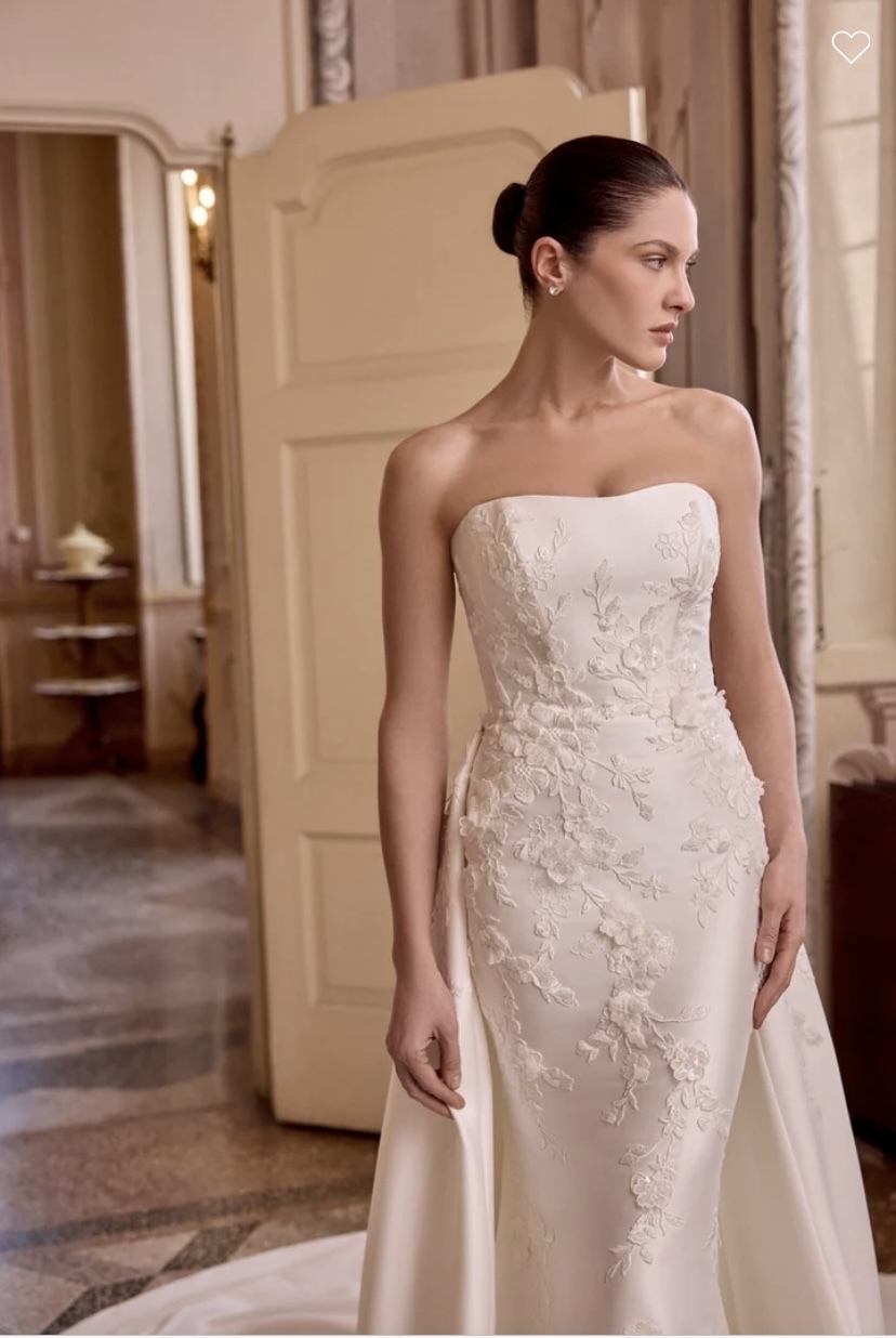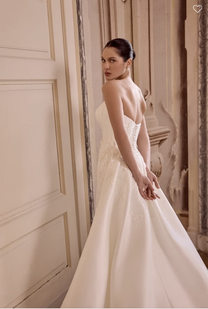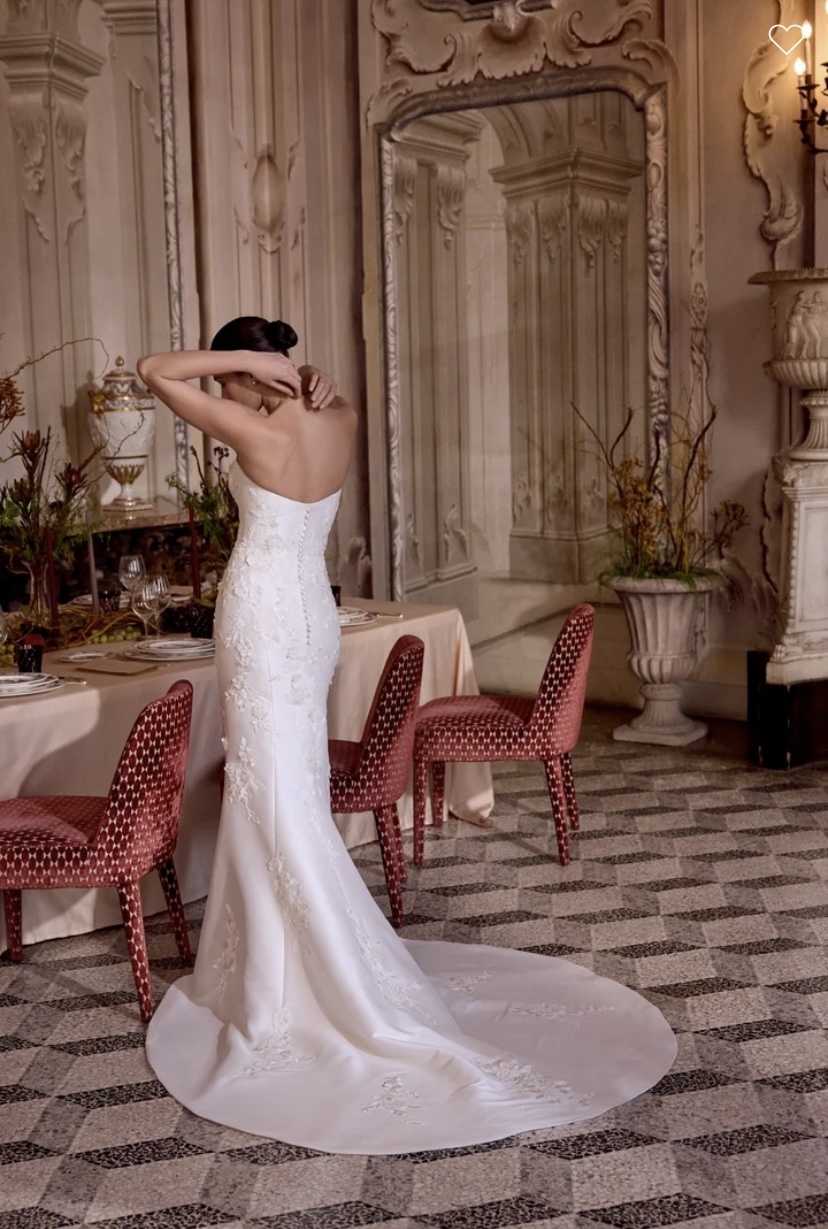 Leigh - Mikado fit & flare gown with a strapless modified sweetheart neckline. Matte lace appliques flow through the bodice and throughout the skirt. Adorned with 3D flowers with tonal bugle beads & sequin details. 3D embroidered flowers also adorn the gown. Back is finished with a subtle Basque waistline and buttons to the end of the zipper. Complete with stylized princess seams down the back of the skirt and onto the chapel length train. Matching detachable train sold separately