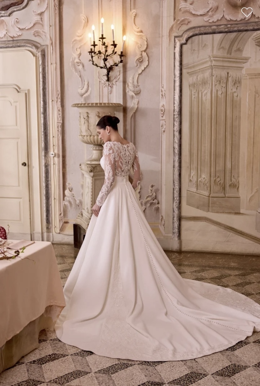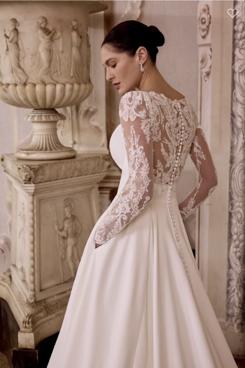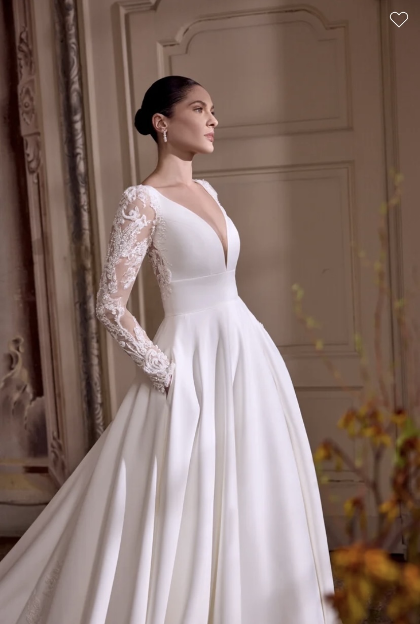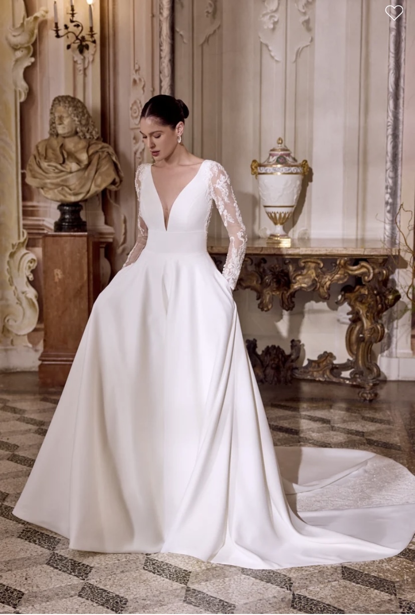 Lisbeth - Matte satin A-line gown with a plunging V-neckline with center front illusion V inset. Bodice is finished with an inset waist. Features tulle long sleeves with a puff shoulder and beaded & sequined lace appliques that continues onto illusion back. Beading includes pearls, tonal seed beads and sequins. Beading on illusion back trickles onto back waistline. Skirt includes pockets and features sparkling appliques down the sides of the back of the skirt. Finished with buttons to end of chapel length train which includes sparkling lace applique train details.