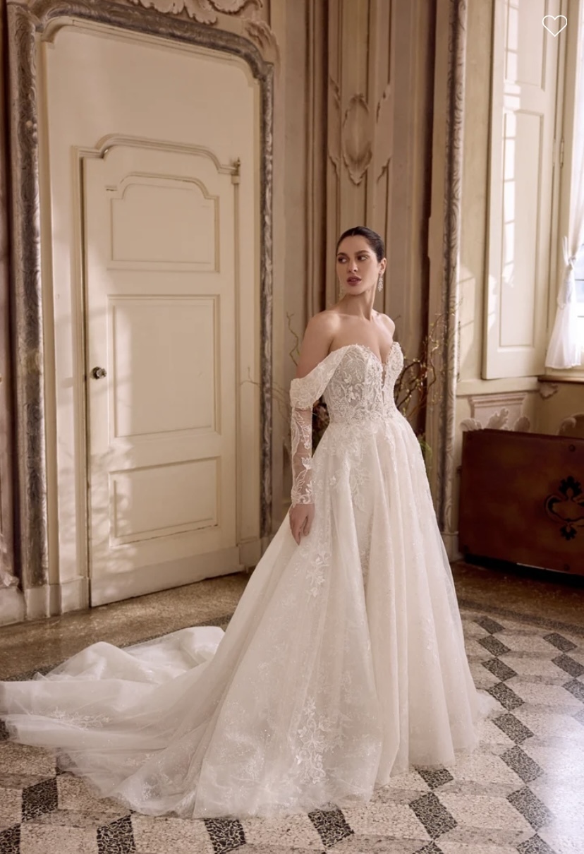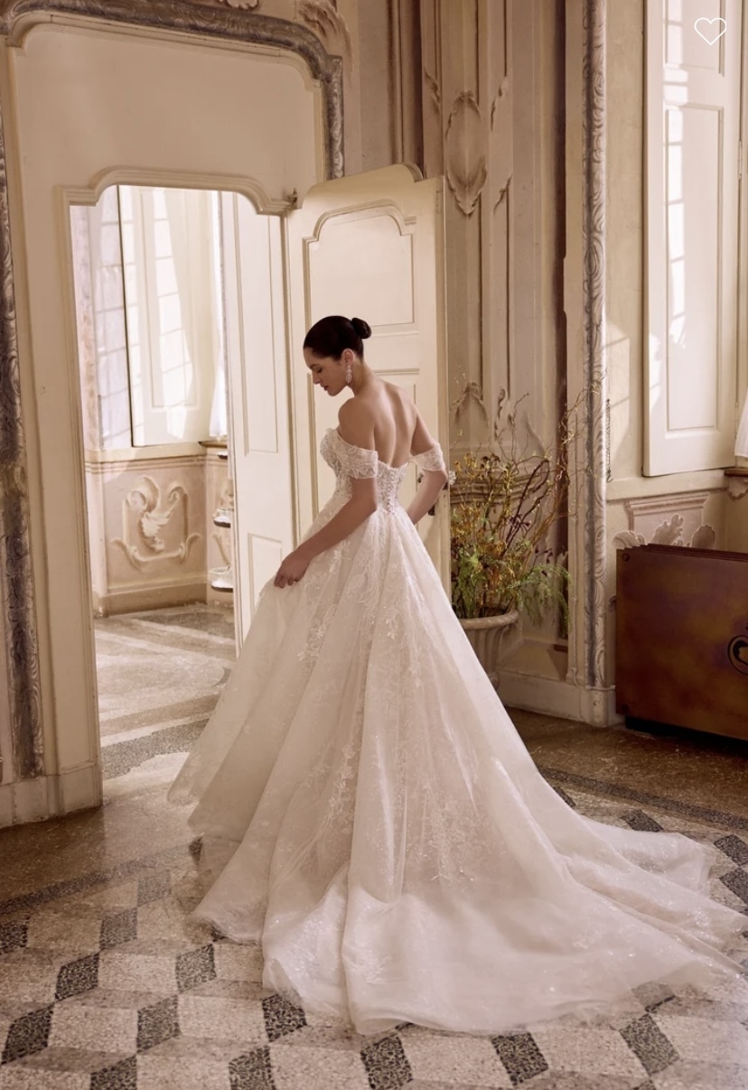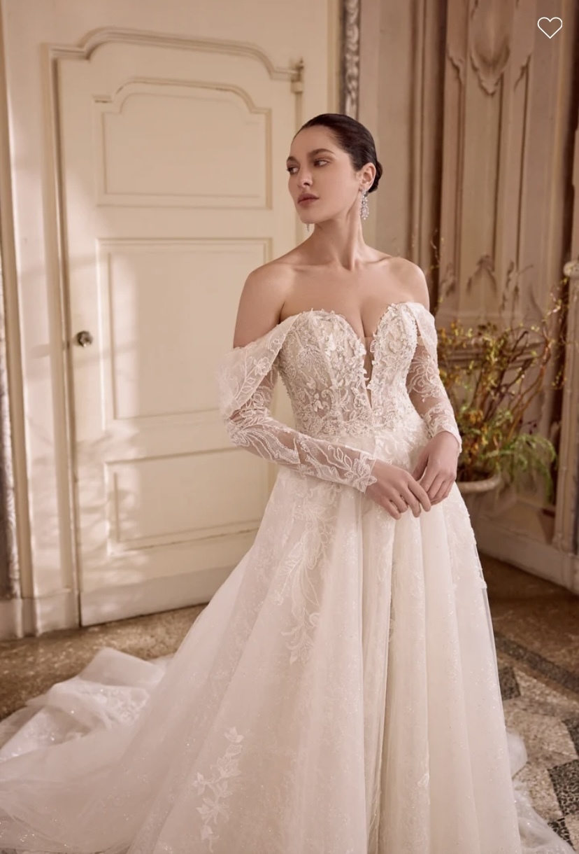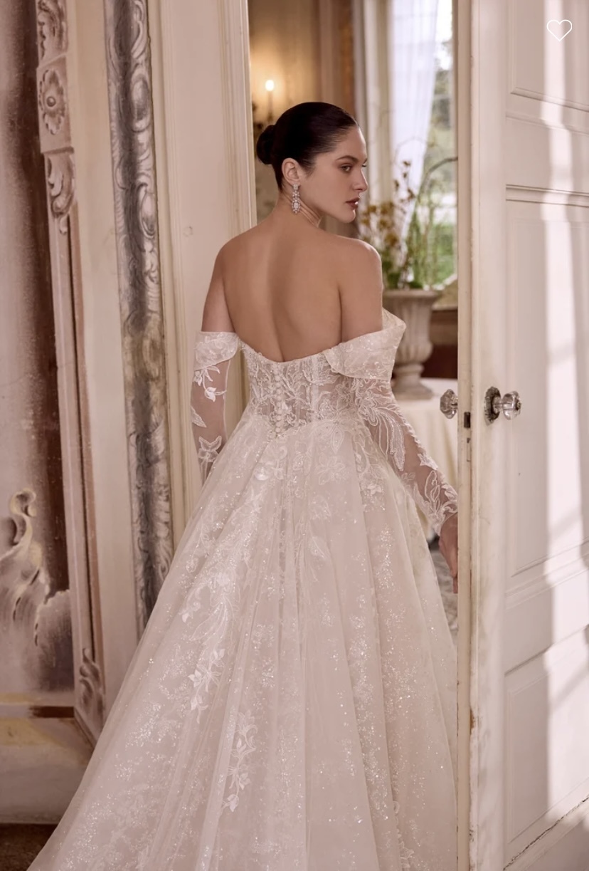 Leilani - Sparkling tulle ball gown with plunging sweetheart neckline and off-the-shoulder straps. Sheer bodice is adorned with beaded & sequined lace appliques and silver crystal diamantes. Beading includes sequins, seed beads, bubble beads, and bugle beads. Exposed boning peeks out from below lace appliques and a layer of patterned glitter tulle which continues throughout skirt. Beaded & sequined lace appliques trickle throughout skirt, Finished with buttons to the back Basque waistline. Complete with chapel length train.