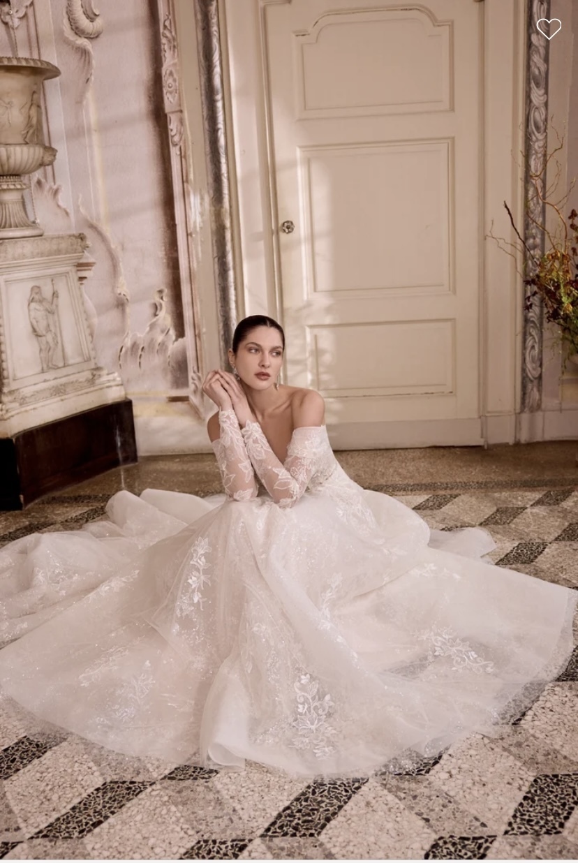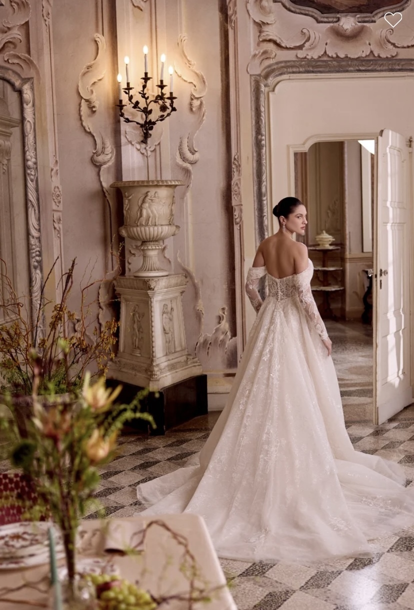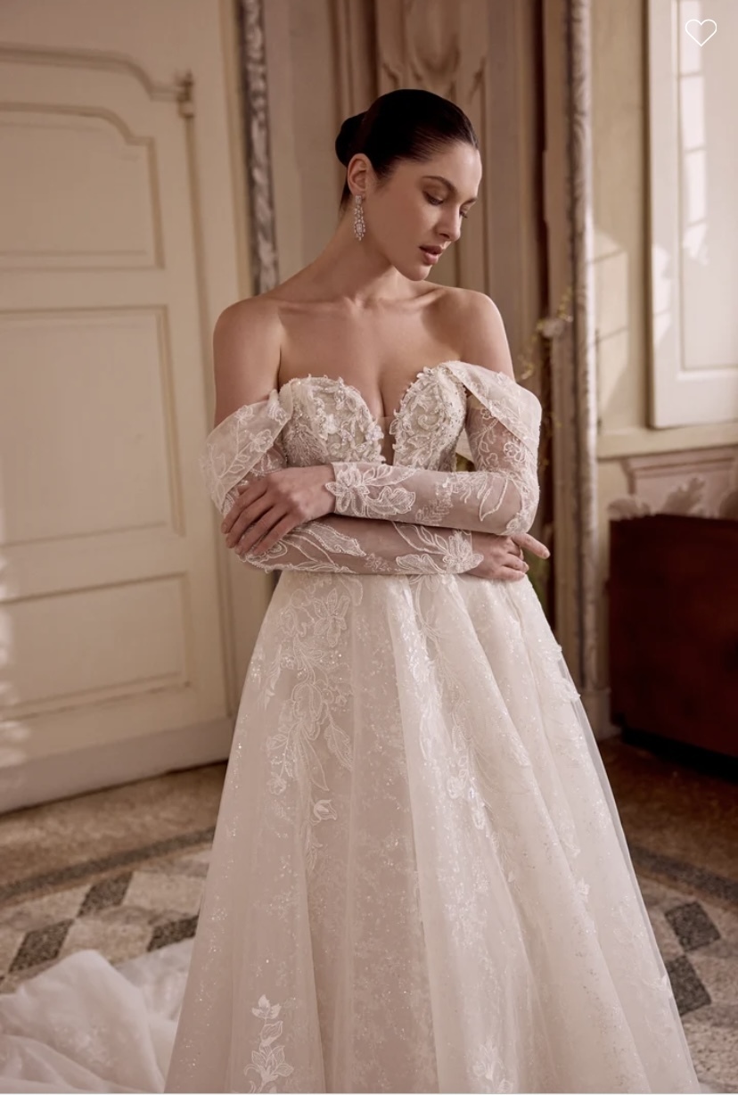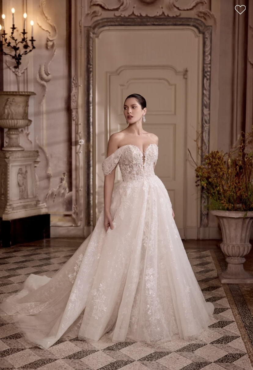 Leilani - Sparkling tulle ball gown with plunging sweetheart neckline and off-the-shoulder straps. Sheer bodice is adorned with beaded & sequined lace appliques and silver crystal diamantes. Beading includes sequins, seed beads, bubble beads, and bugle beads. Exposed boning peeks out from below lace appliques and a layer of patterned glitter tulle which continues throughout skirt. Beaded & sequined lace appliques trickle throughout skirt, Finished with buttons to the back Basque waistline. Complete with chapel length train.