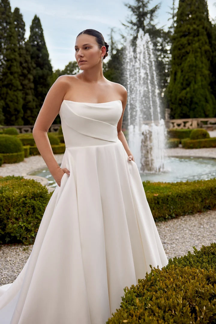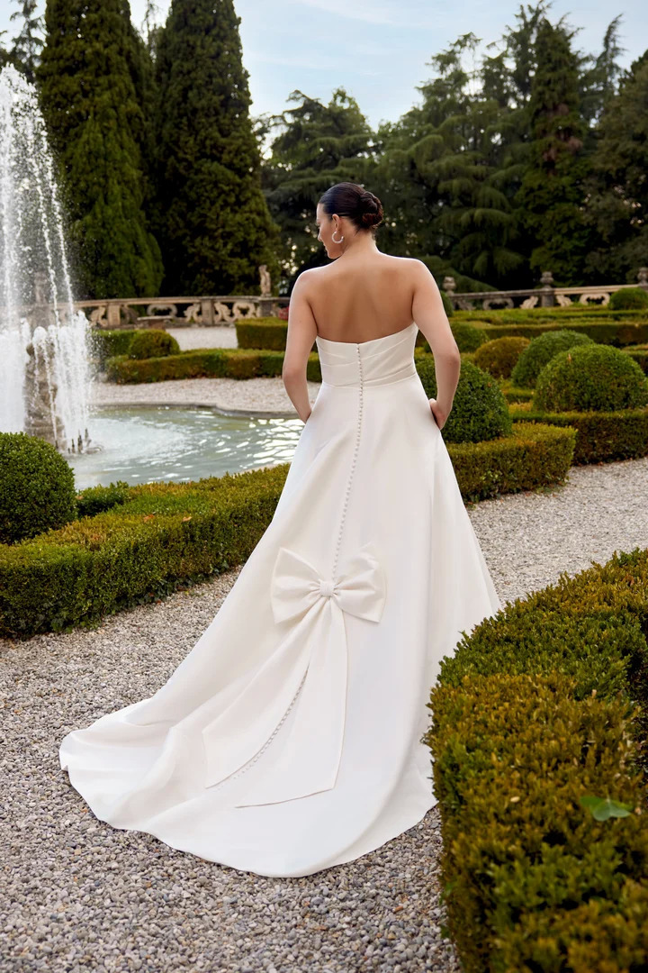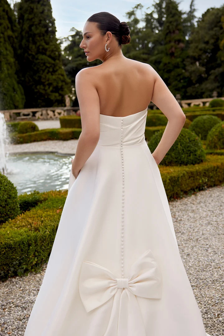 A clean and crisp beauty, this A-line wedding dress is a fashionable take on the minimalistic trend. This luxurious Mikado A-line features a stylized strapless neckline that is accented with asymmetric pleating. A matching bow on the train adds a unique design detail that loops onto the natural waist to instantly create a perfect bustle. The style is finished with pockets and Mikado covered buttons to the end of the chapel length train.