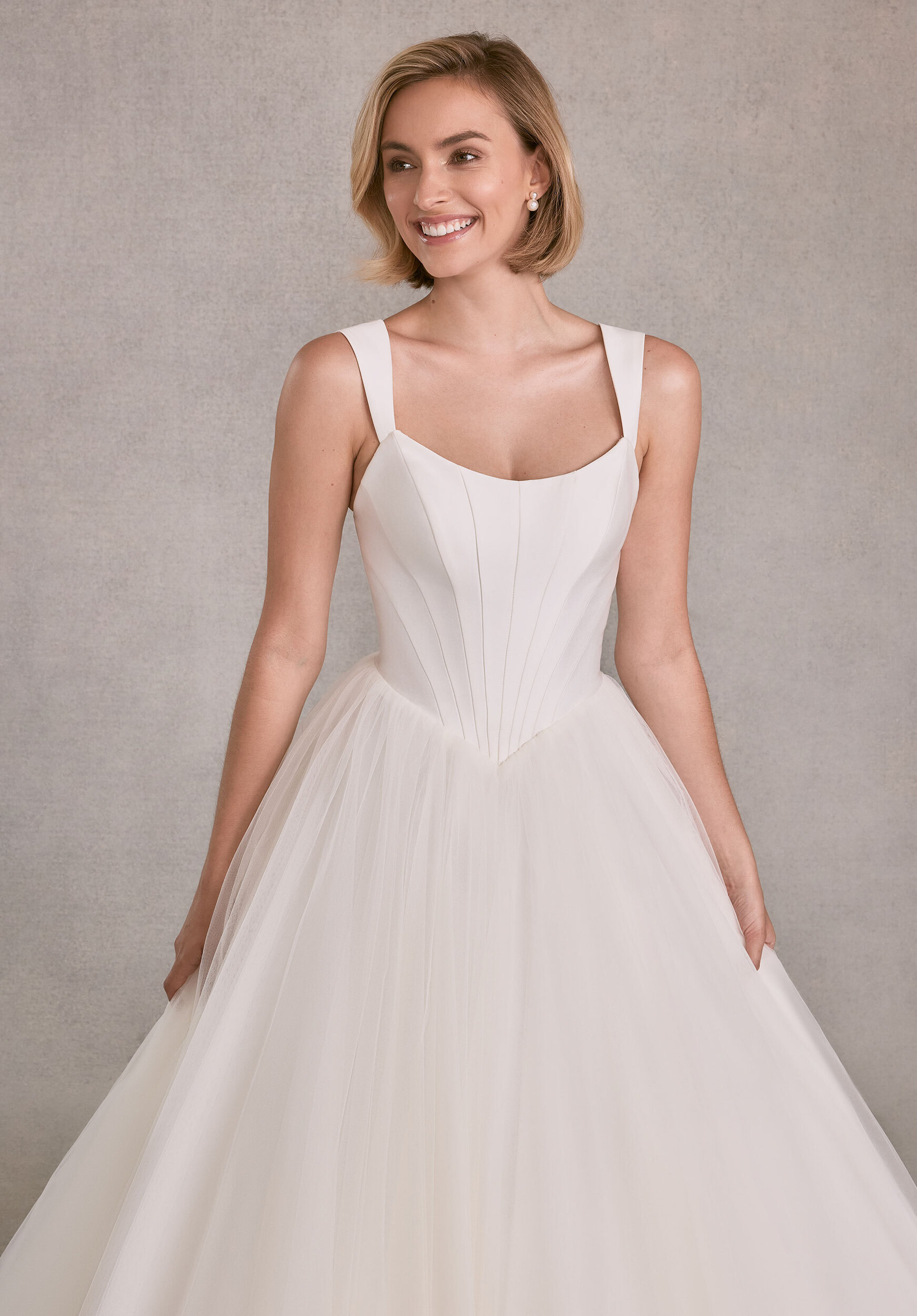 Style 2753 is a classic ball gown with modern touches. The satin bodice has a delicate glow with a modified scoop neckline and wide shoulder straps that beautifully frame your décolletage. Corset seaming creates clean lines that lead to the basque waist, drawing the eye in and enhancing the shape of the ball gown silhouette. The full tulle skirt billows around you for a simple, yet timeless, wedding day look.