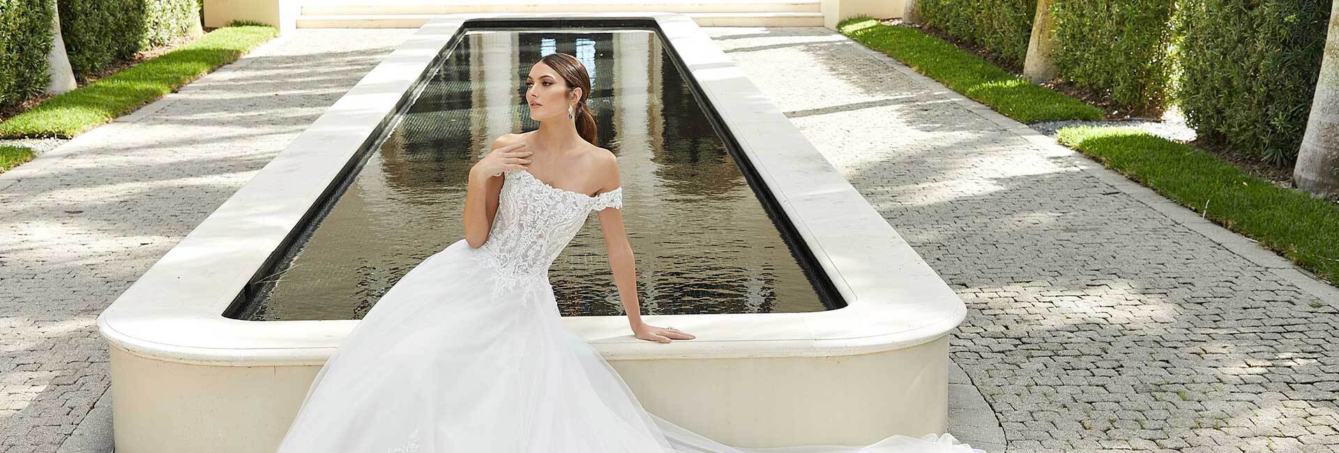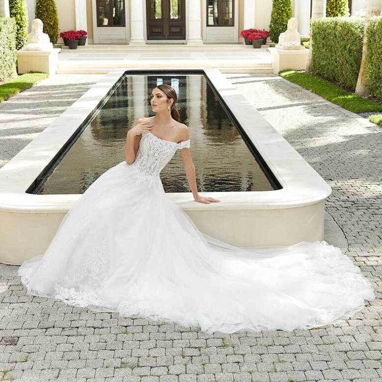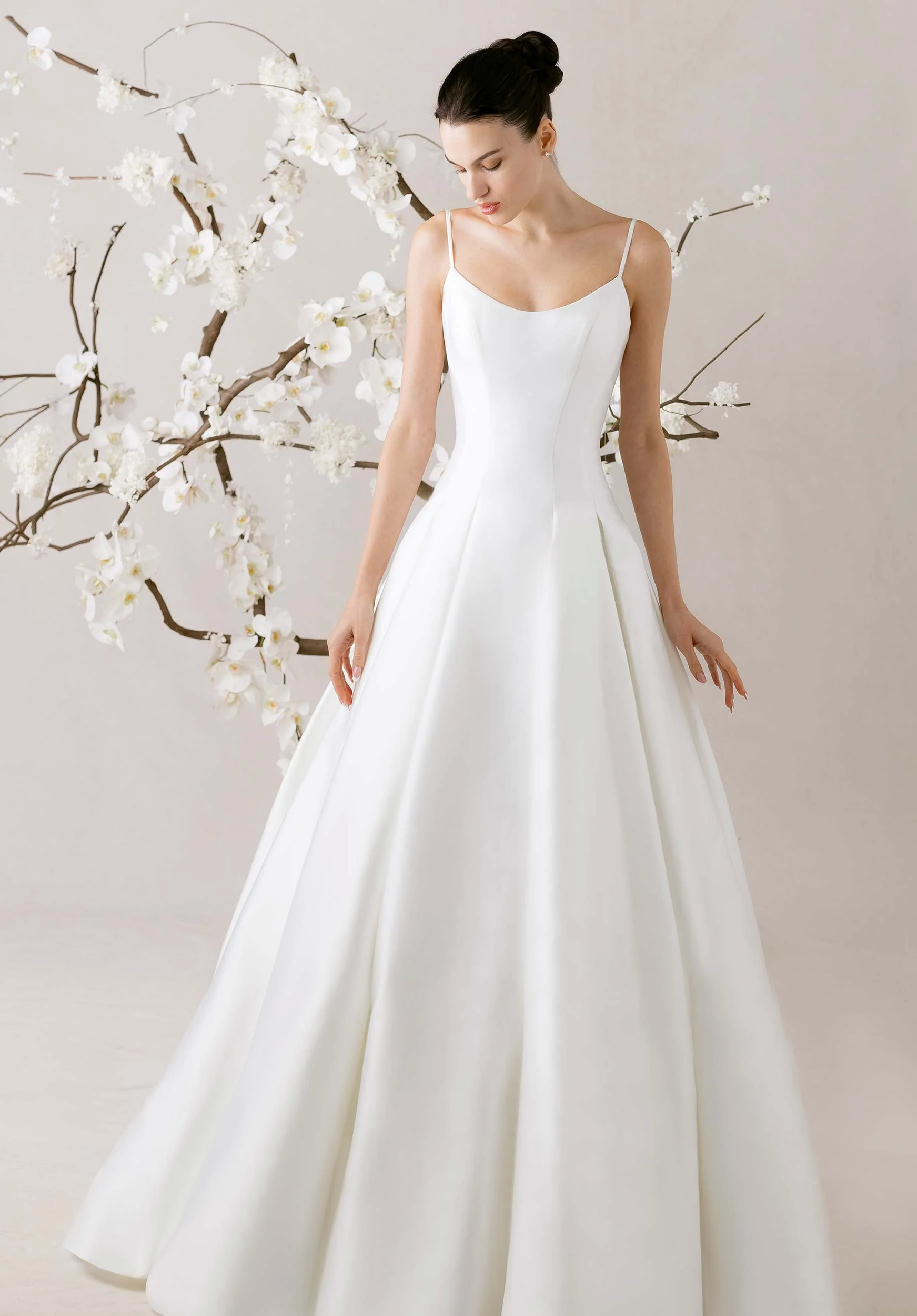 Radiant and refined, our Vivienne wedding dress is a Mikado ball gown that exudes effortless sophistication. A soft scoop neckline and matching scoop back are framed by delicate thin straps, while elongating princess seams sculpt the silhouette with subtle precision, elongating the silhouette. Buttons trail gracefully down the back to the flowing train, adding a hint of classic romance. The full skirt floats with serene elegance, creating a gown that feels airy, luminous, and simply captivating.