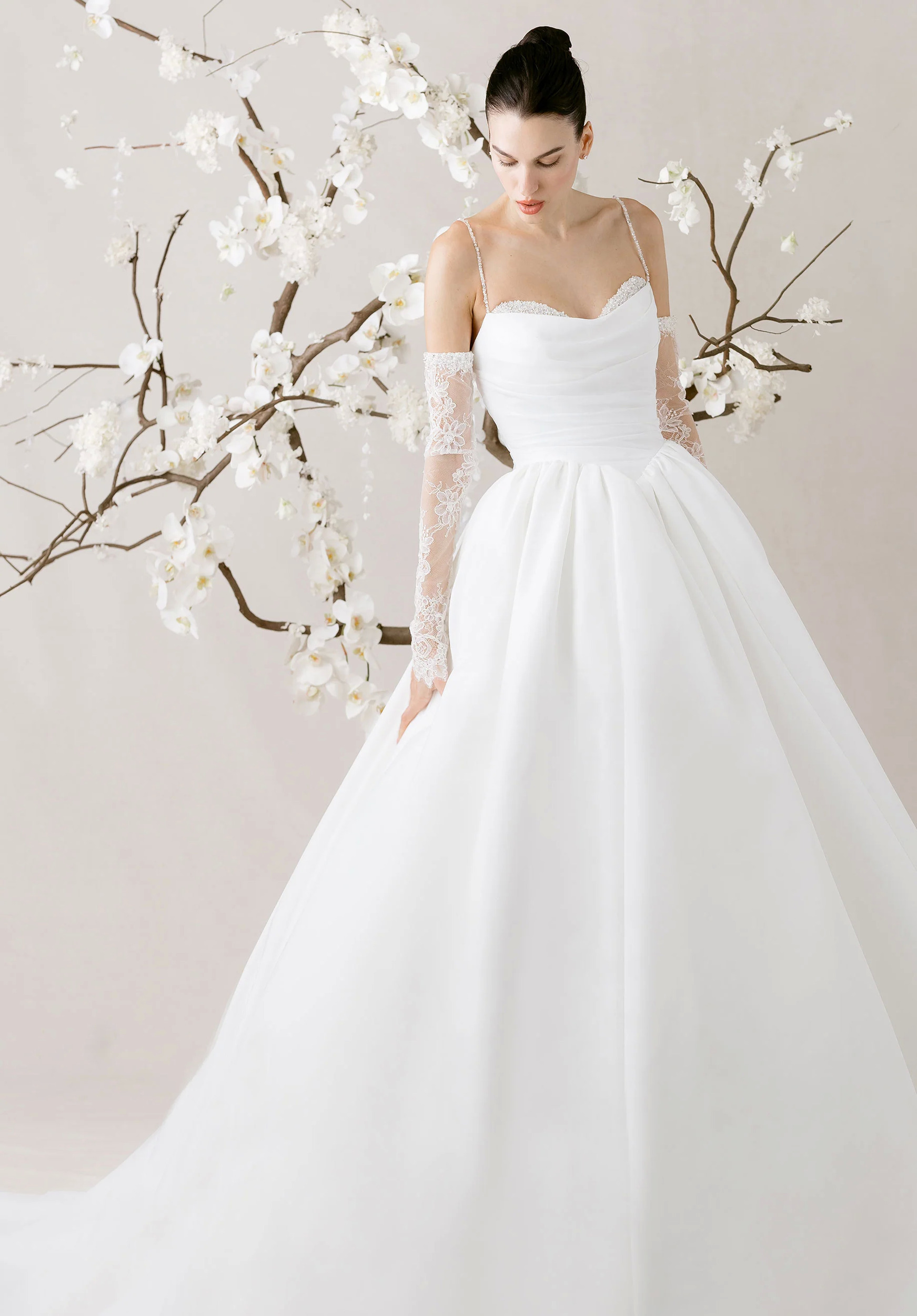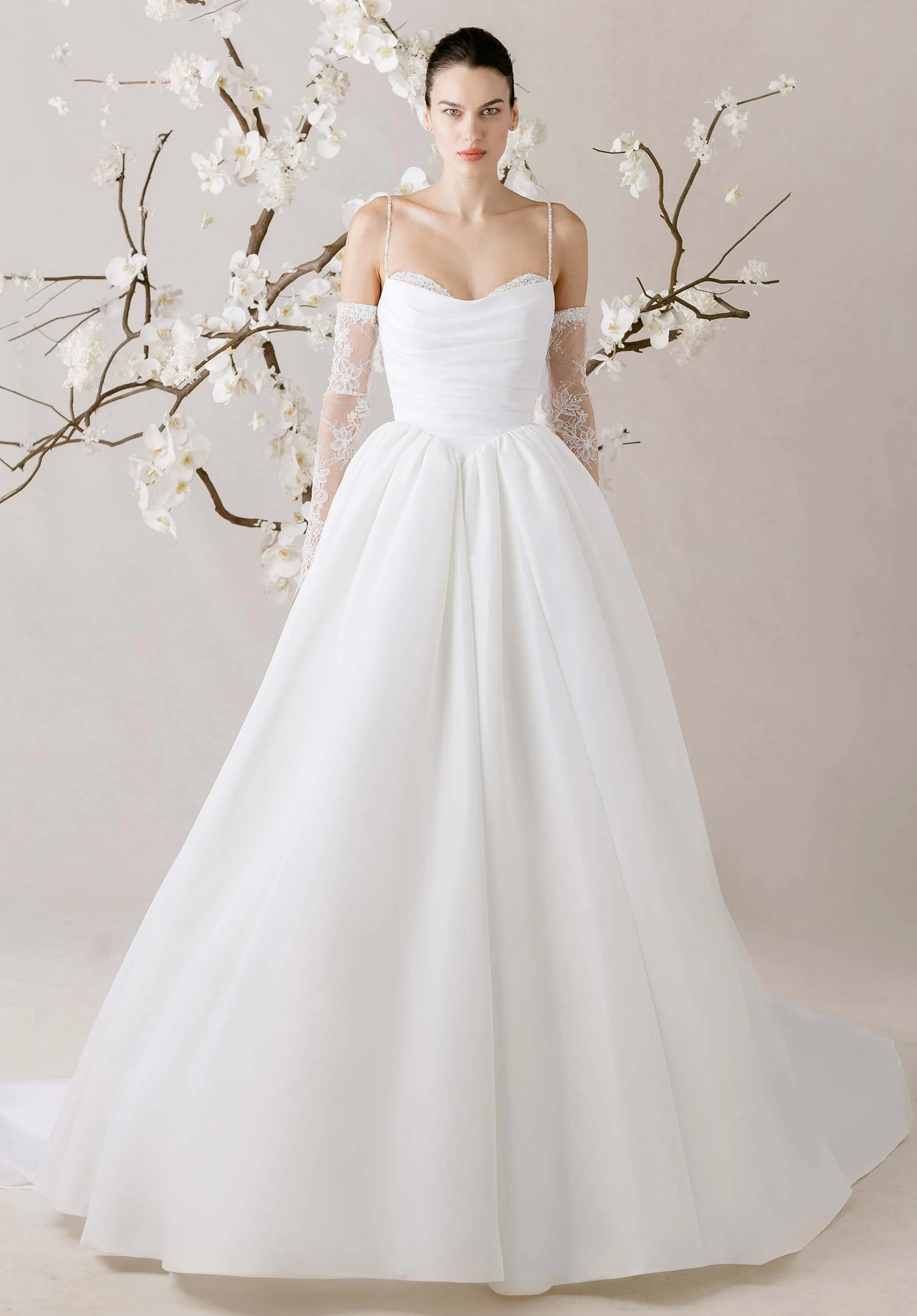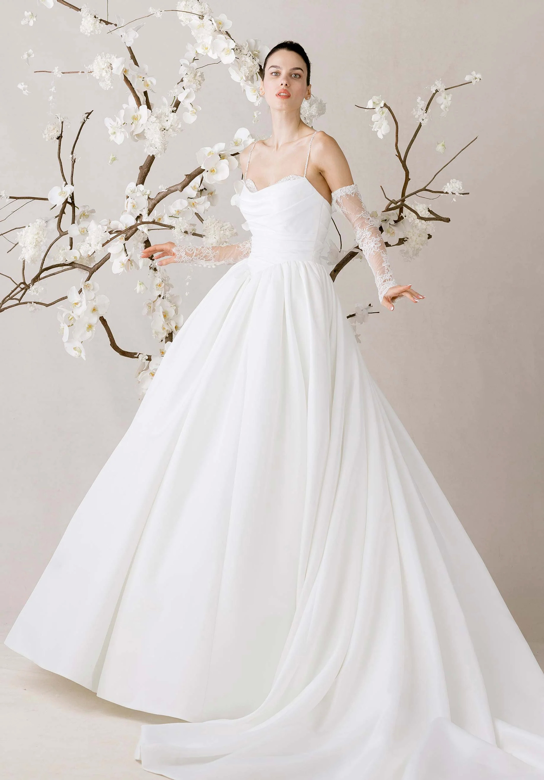 Our Élevé wedding dress is a faille ball gown that captures the elegance of soft movement. The scoop neckline features a sweetheart Chantilly lace peek-a-boo detail, framed by delicate sequin and beaded straps that shimmer with quiet light. A basque waist draws the eye in, enhancing the flare of the skirt, while the lace-up corset back sculpts the silhouette. For an ethereal touch, pair the gown with the matching lace gauntlet sleeves.