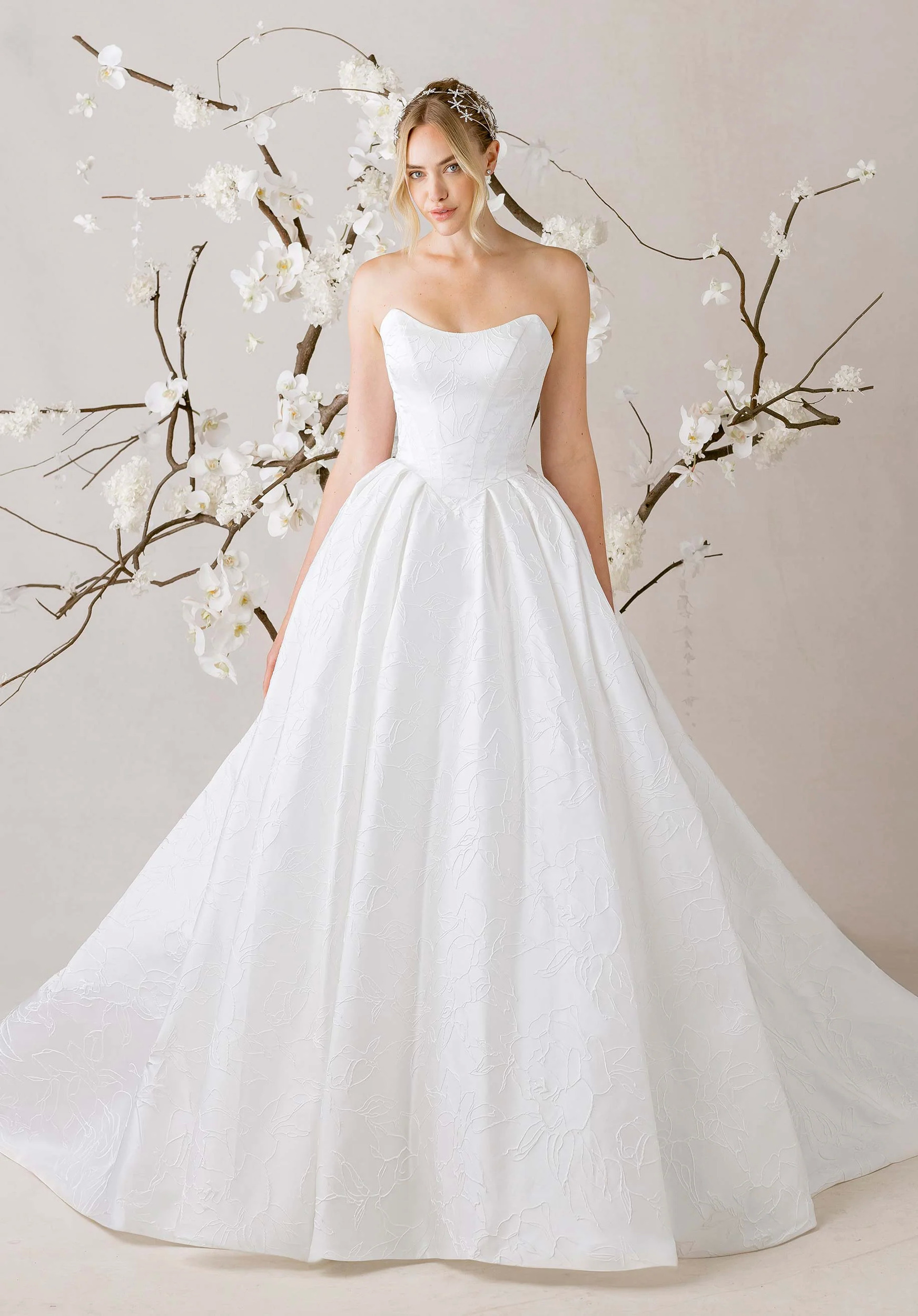 Refined and sculptural, our Coppéllia wedding dress moves with the poise of a dancer. The strapless neckline frames the décolletage with its exaggerated scoop shape, while a basque waist bodice sculpts the figure to a defined point. Pleated layers of textured floral brocade cascade into a sweeping skirt, creating an elegantly embossed effect. The gown exudes a sense of airy elegance and poetic grace, balancing structured sophistication with effortless movement.