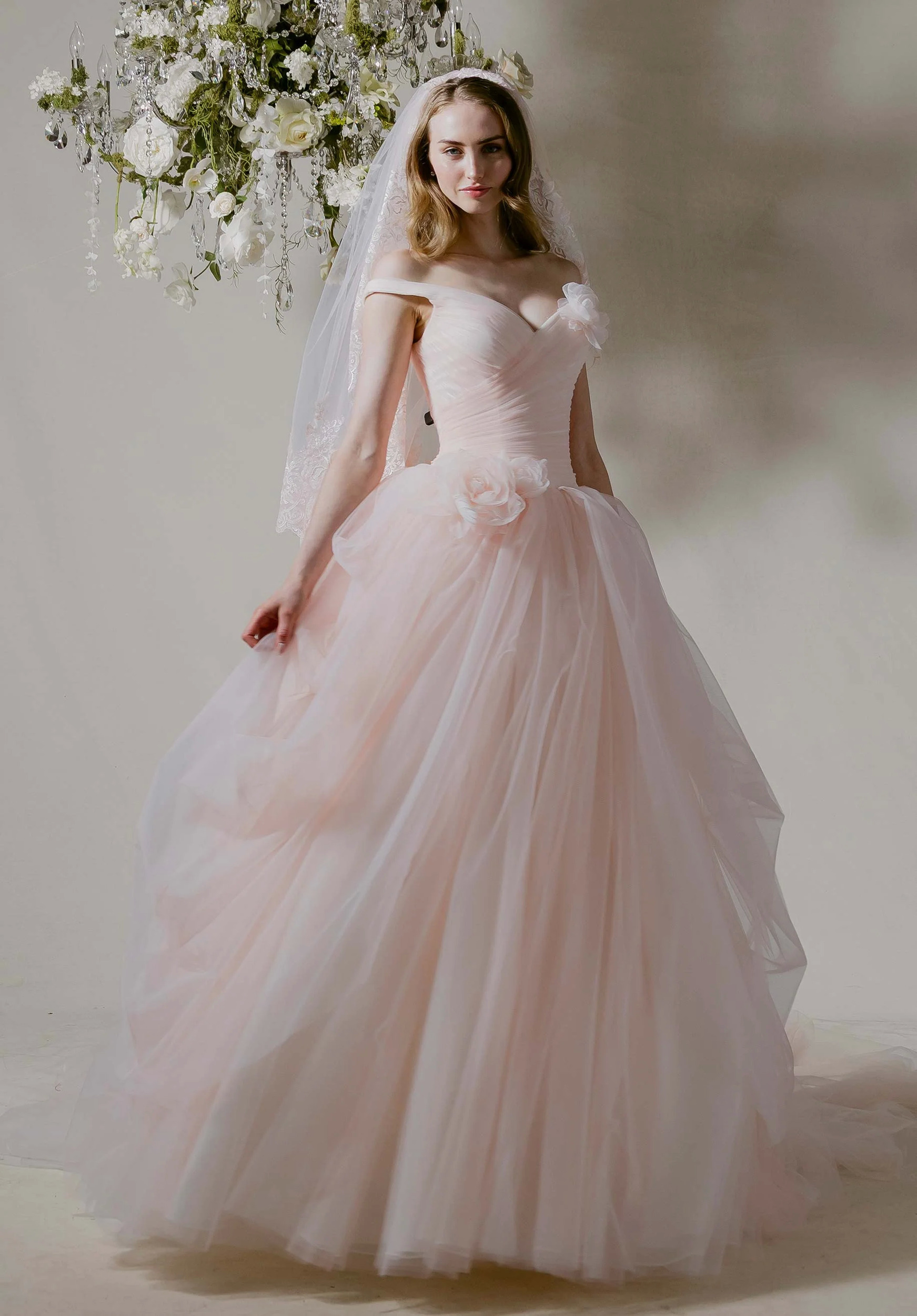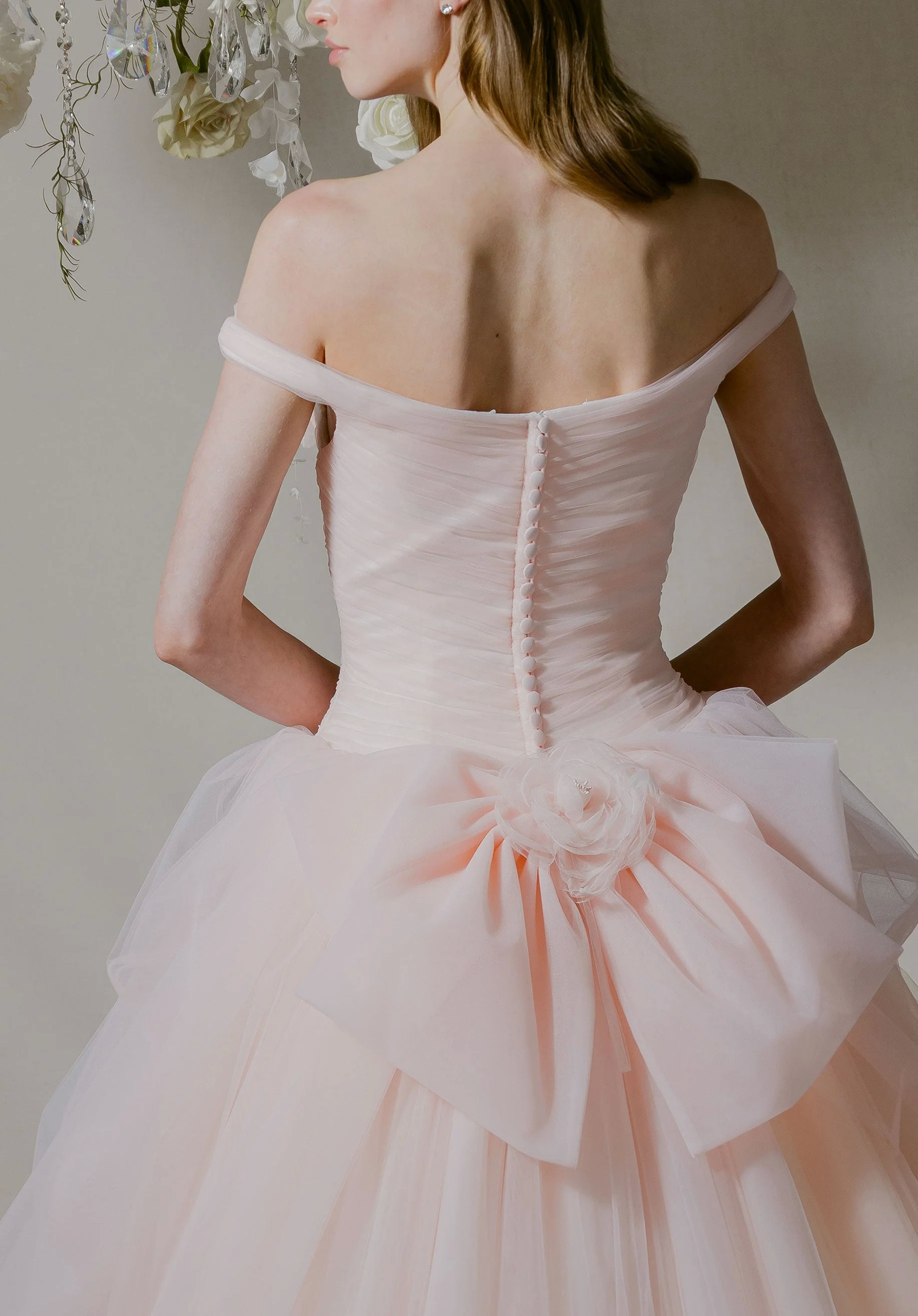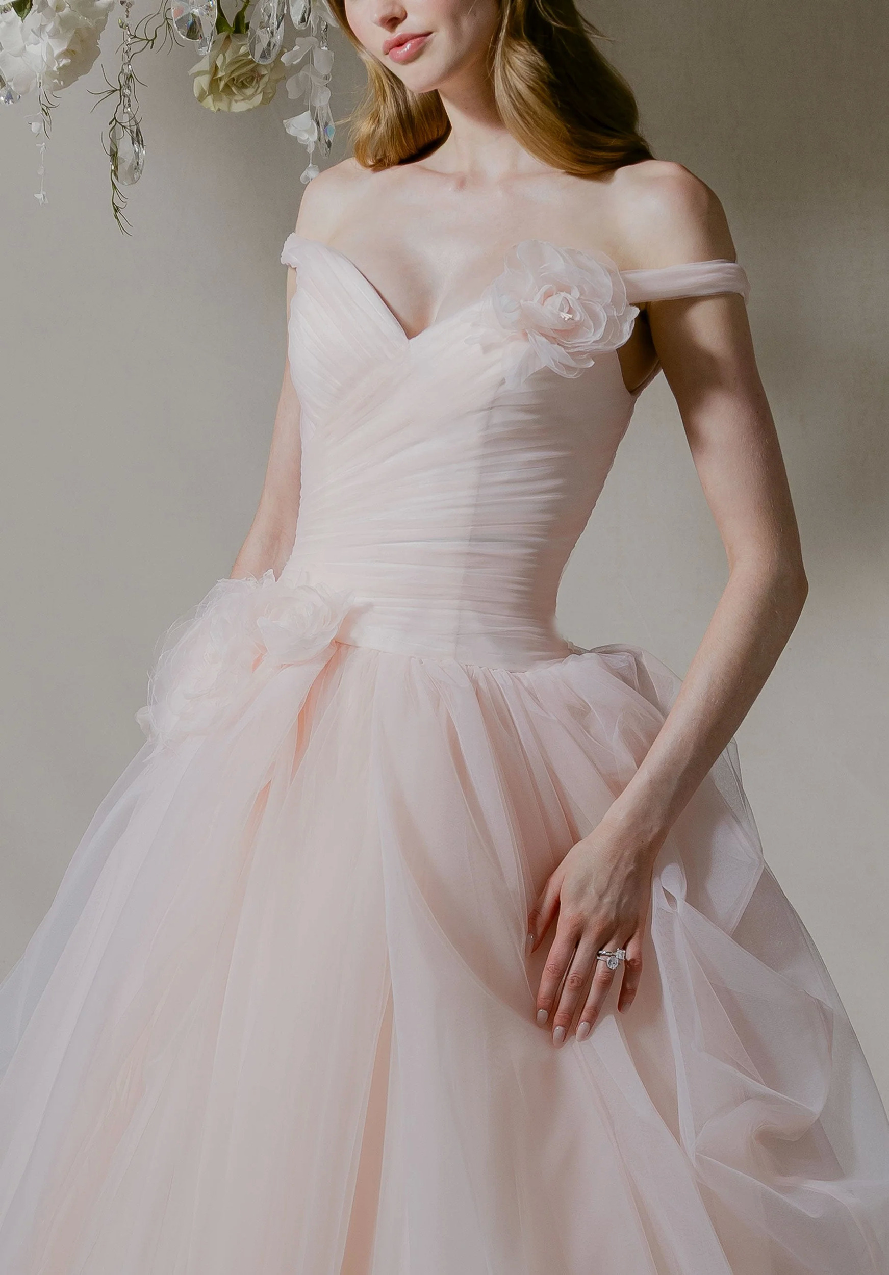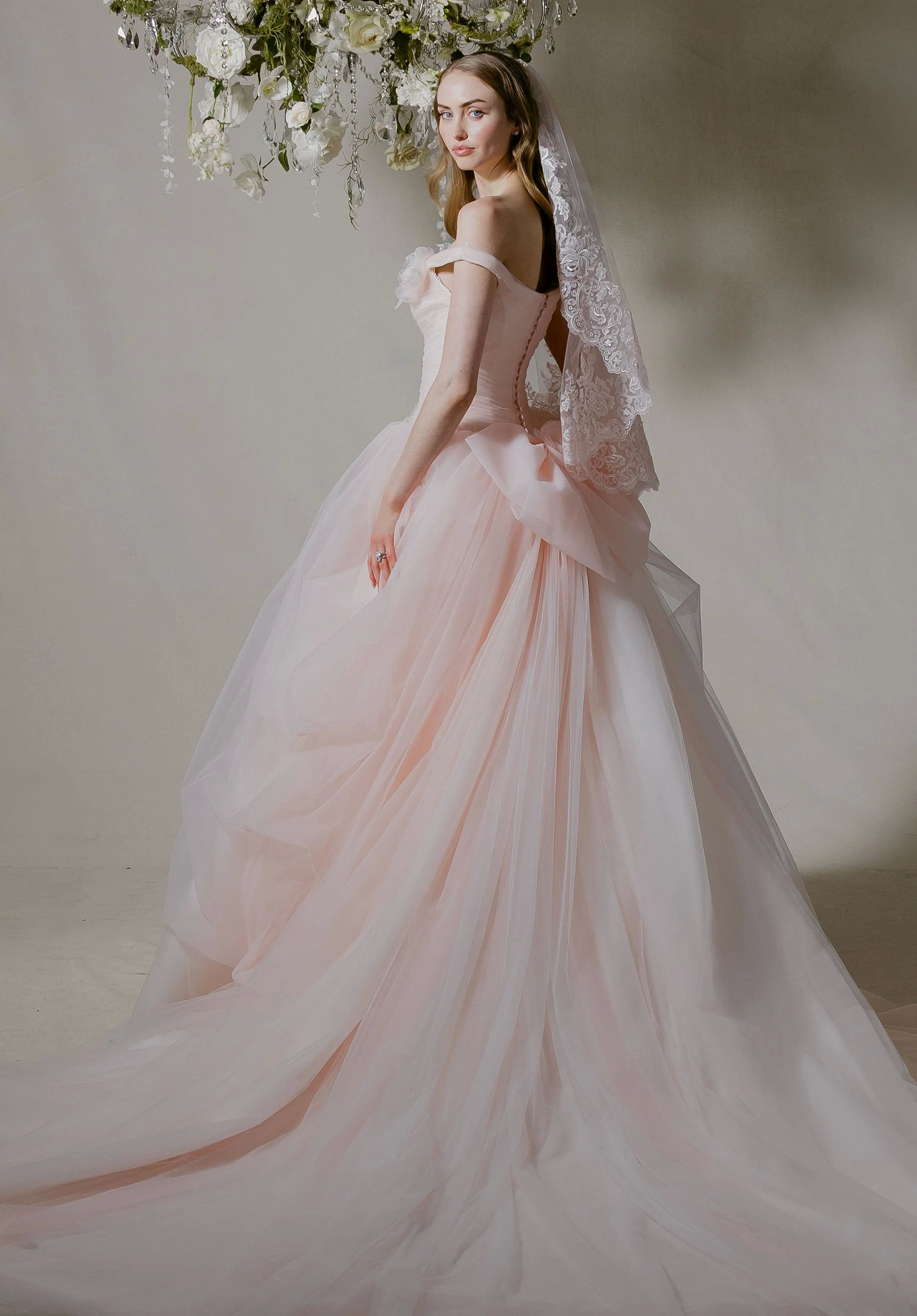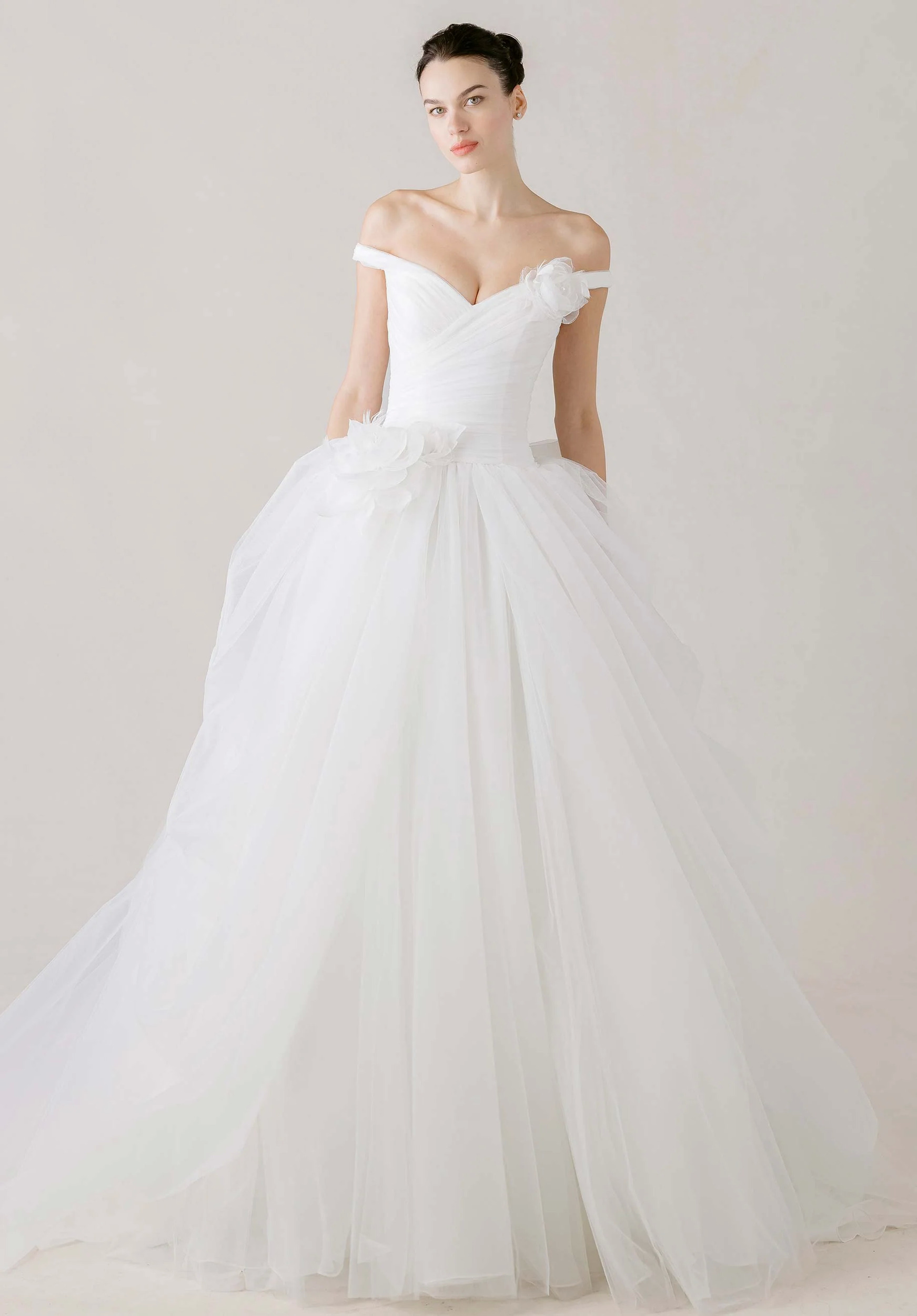 Like a final pirouette, our Lucienne wedding dress is soft yet unforgettable. This off-the-shoulder ball gown has a sculpted v-neck neckline that flows into a draped drop waist bodice, seamlessly melting into a voluminous pick-up skirt that billows with airy elegance. A sweeping train extends the drama, while a detachable 3D flower and bow add a whimsical flourish. Matching veil sold separately as Style 55008.
