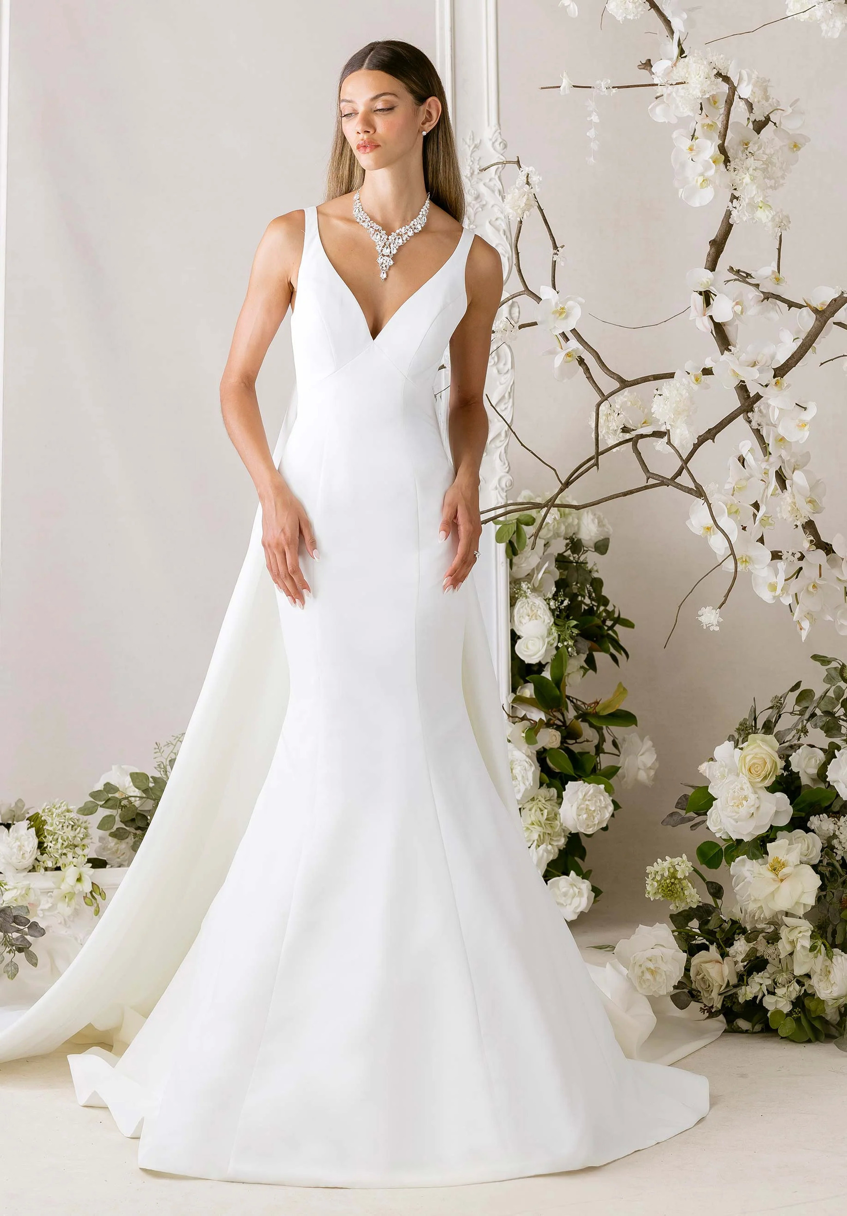 Our Bex wedding dress blends minimalism and romance, creating a look that is both perfectly posed and quietly captivating. The v-neckline graces the sleeveless bodice, while princess seams enhance the natural silhouette, sculpting the figure with clean, precise lines. The square-shaped back offers modern simplicity, and a detachable Watteau back adds a soft, flowing drama that moves with graceful ease.