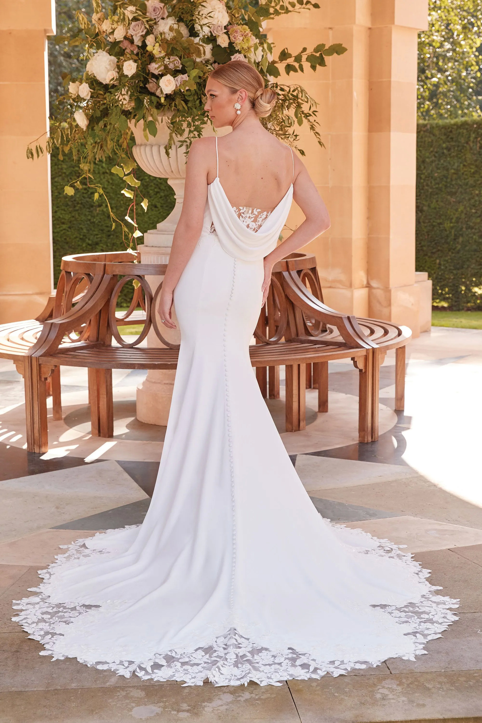 Minimalistic with unexpected details, this crepe fit and flare bridal gown will make you look breathtaking as you walk down the aisle. The stylized V-neckline is given spaghetti straps that lead to an illusion square back with a cowl detail. Sequined lace appliqués add a subtle sparkle and extend to create a stunning cutout cathedral length train. Covered buttons cascading down the back complete the look.