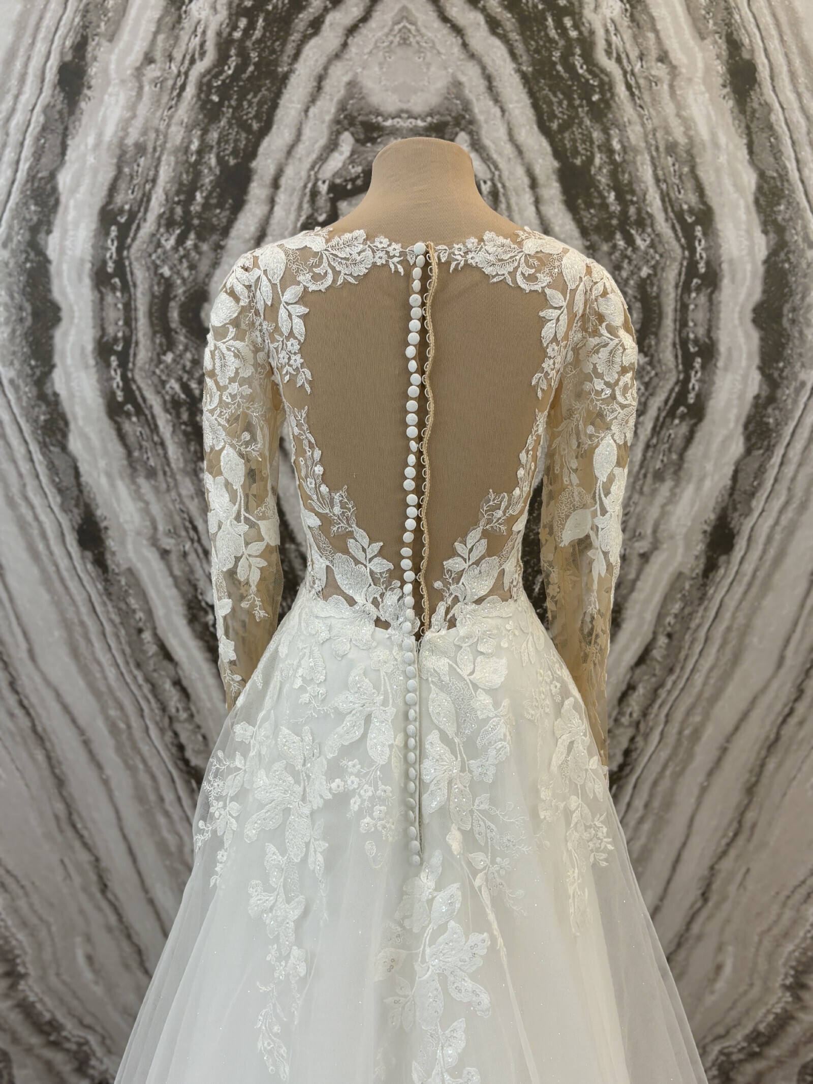 Aline dress embelished with lace and tulle with a full sleeve, illusion back and side split. timeless elegance with a modern twist.