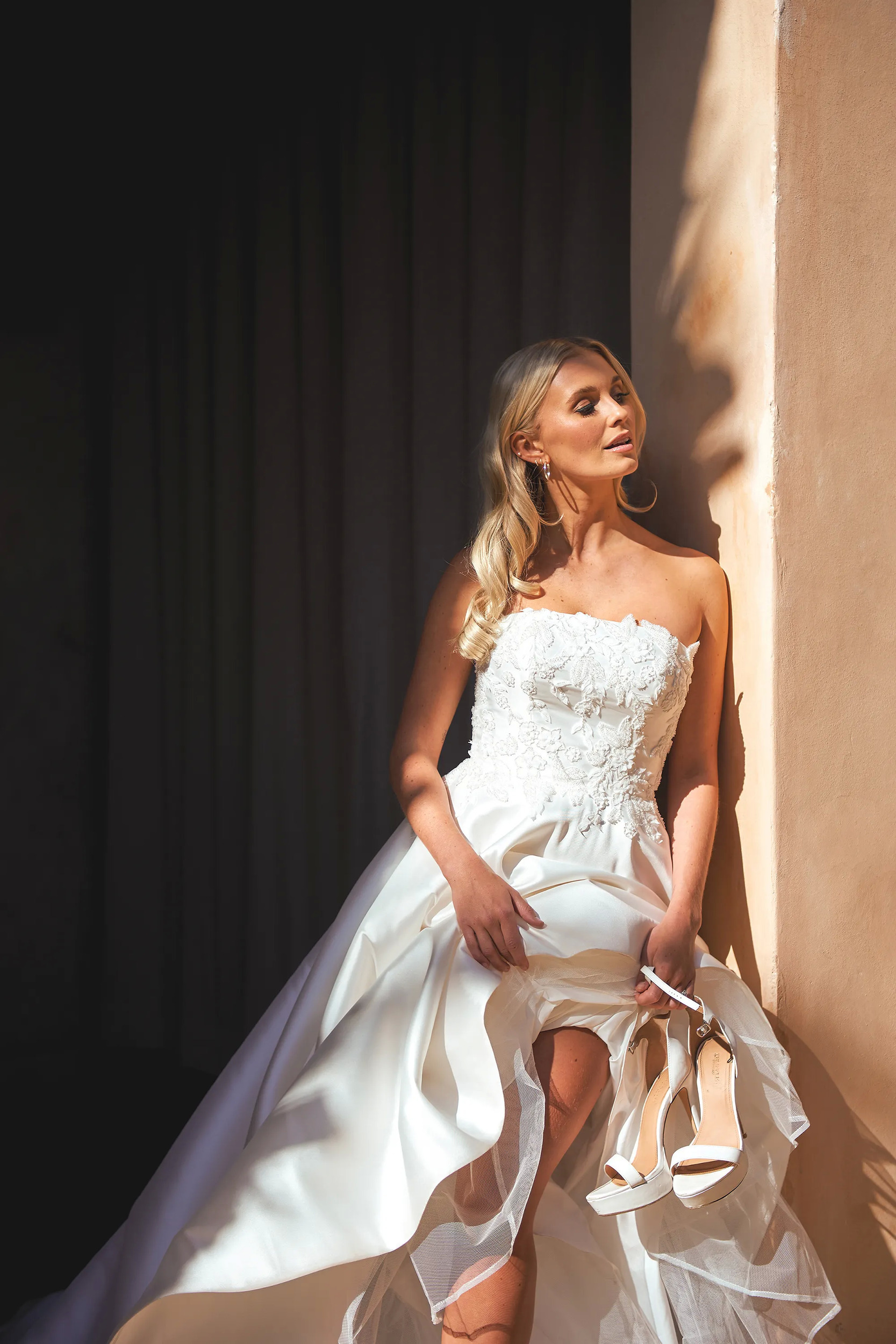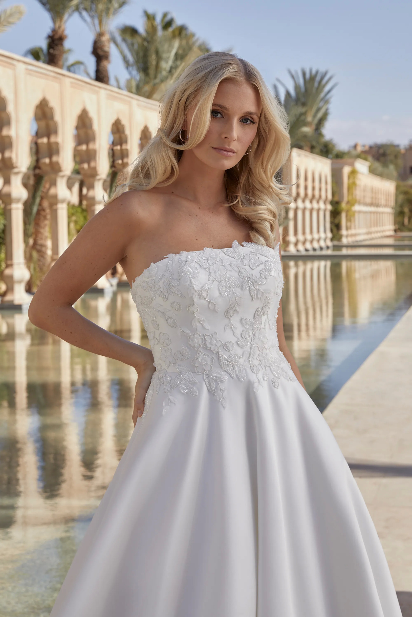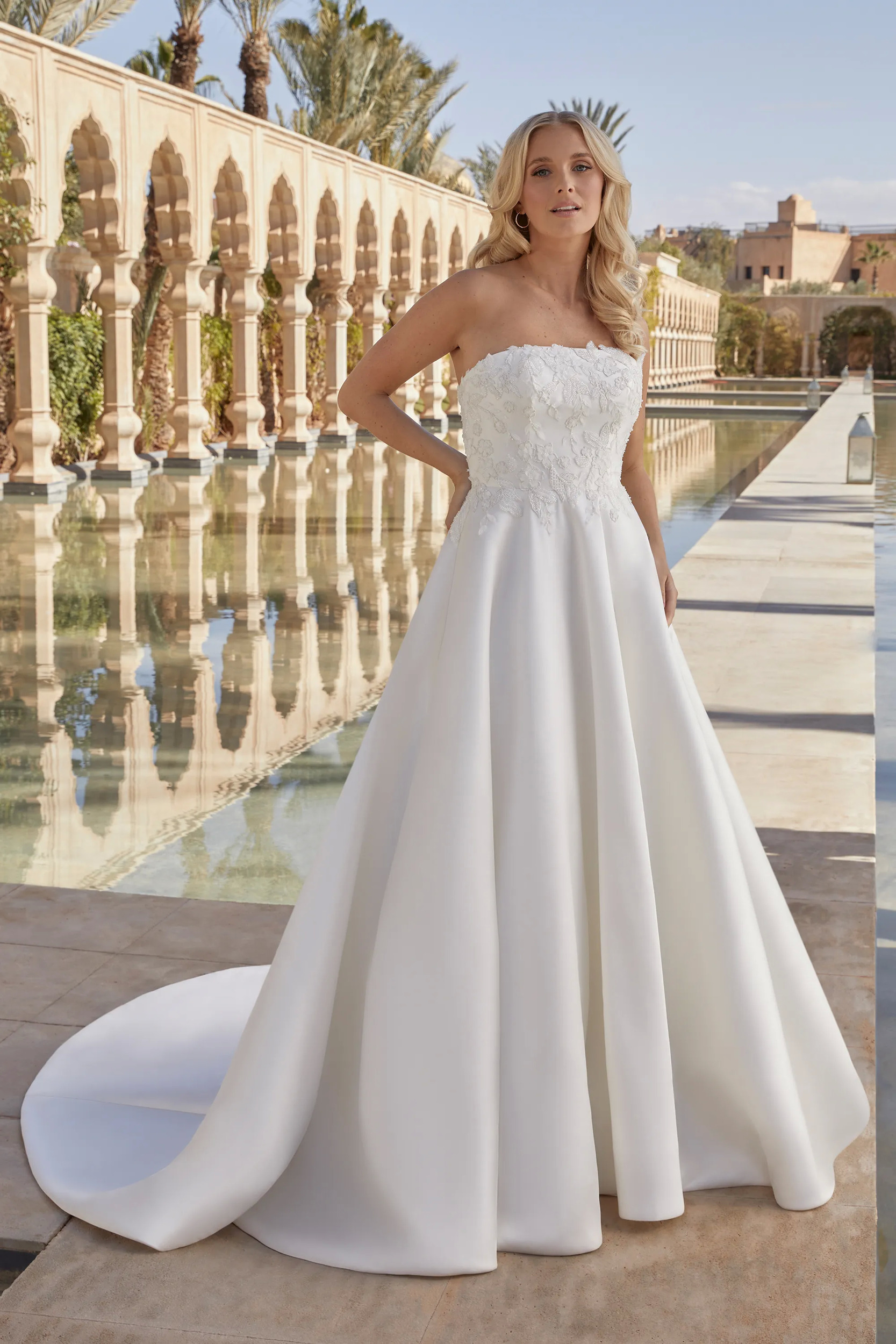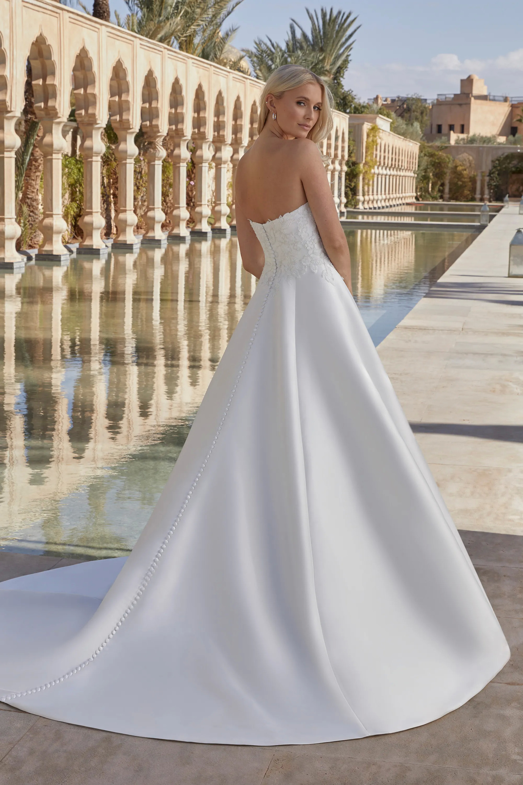 Strapless Mikado ball gown with straight neckline. Embellished with tonal beaded lace appliques embroidered with silver thread and 3D chiffon florals. Finished with pockets and Mikado covered buttons extending to end of chapel length train.