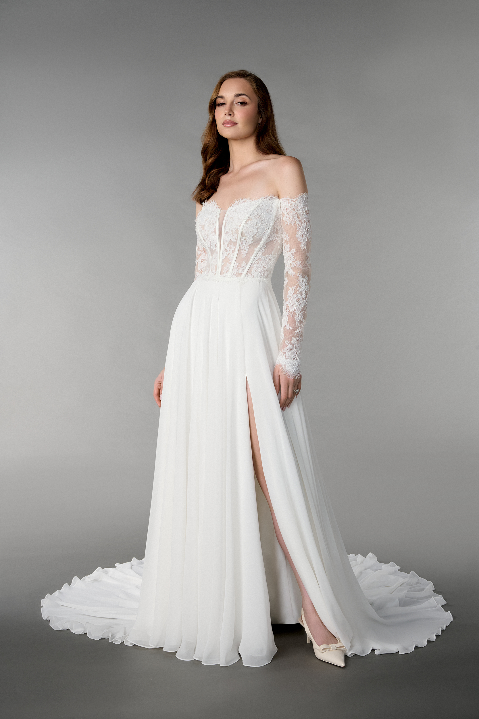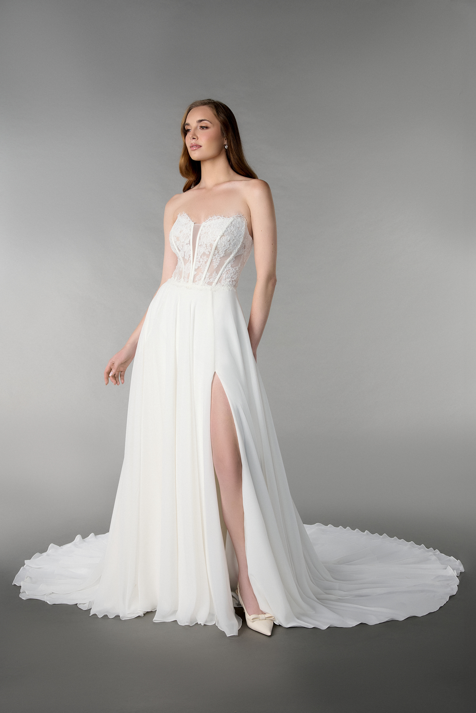 Corded Alencon lace gown with a strapless plunging notch neckline. Sheer bodice features allover corded Alencon lace with exposed boning. Paired with a chiffon skirt which reveals a side slit. Finished with buttons to the waist. Complete with a chapel length train. Matching off-the-shoulder long sleeves sold separately.